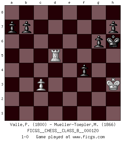 Last move : 1-0 2011 September 17 21:46:22 [Event "FICGS__CHESS__CLASS_B__000120"] [Site "FICGS"] [Date "2010.08.21"] [Round "1"] [White "Valle,Paul"] [Black "Mueller-Toepler,Michael"] [Result "1-0"] [WhiteElo "1800"] [BlackElo "1866"] 1.Nh3 d5 2.g3 e5 3.f4 Bxh3 4.Bxh3 exf4 5.O-O fxg3 6.e4 gxh2+ 7.Kh1 dxe4 8.Nc3 Nf6 9.d3 Nc6 10.Qe2 Bd6 11.Qg2 e3 12.Bxe3 O-O 13.Bg5 Be7 14.Rae1 Ne8 15.Bf4 Bd6 16.Bg5 f6 17.Bh6 Be5 18.Ne4 Kh8 19.Be3 Nd6 20.Nc5 f5 21.Ne6 Qf6 22.Nxf8 Qxf8 23.c3 g6 24.d4 Bf6 25.Qxh2 Qf7 26.Bf4 Rd8 27.Bg2 Qxa2 28.d5 Ne7 29.Re6 Ng8 30.Be5 Rf8 31.Bxd6 cxd6 32.Qxd6 Rd8 33.Qc7 Rxd5 34.Qf7 Rd2 35.Rxf6 Qxb2 36.Bd5 Rxd5 37.Qxd5 Nxf6 38.Qd8+ Kg7 39.Qe7+ Kg8 40.Rd1 Nd5 41.Qe6+ Kg7 42.Qe5+ Nf6 43.Rd7+ Kh6 44.Qxf6 Qf2 45.Qd4 Qf3+ 46.Kh2 f4 47.Qg7+ Kg5 48.Qe7+ Kf5 49.Qf7+ Kg4 50.Qe6+ Kg5 51.Rd5+ Kh6 52.Qh3+ Qxh3+ 53.Kxh3 1-0 Amar gambit Kingside Castling by player White (move 5) Kingside Castling by player Black (move 12) 10 pieces endgame at move 52 : White KRP , Black KQPPPPP WHITE : King + 1 Rook 1 Pawn BLACK : King + 1 Queen 5 Pawns 9 pieces endgame at move 53 : White KRP , Black KPPPPP WHITE : King + 1 Rook 1 Pawn BLACK : King + 5 Pawns Player White won this chess game. Follow this game move after move (download)One of these modest little moves may be more embarrassing to your opponent than the biggest threat. (Siegbert Tarrasch) Kein Großmeister ist normal. Sie unterscheiden sich nur im Ausmaß Ihrer Verrücktheit. (Viktor Kortschnoi) El juego de Damas es para vagabundos. (Paul Morphy) Je crois qu'il existe des manières très spécifiques de jouer efficacement contre une machine. Evidemment, nous n'avons aucune chance en technique pure, parce que l'ordinateur calcule de manière parfaite. Mais lorsque nous faisons appel à notre cerveau, en utilisant l'intuition et la compréhension, alors nous restons beaucoup plus forts. (Anatoli Karpov) For peace of mind, resign as general manager of the universe. (Douglas Adams)