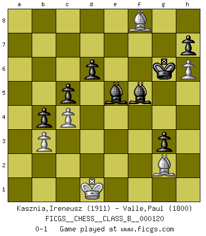 Last move : 0-1 2010 September 25 12:0:52 [Event "FICGS__CHESS__CLASS_B__000120"] [Site "FICGS"] [Date "2010.08.21"] [Round "1"] [White "Kasznia,Ireneusz"] [Black "Valle,Paul"] [Result "0-1"] [WhiteElo "1911"] [BlackElo "1800"] 1.d4 e5 2.dxe5 Nc6 3.Nf3 Qe7 4.Bg5 Qe6 5.Nc3 Nxe5 6.Qd4 Nxf3+ 7.gxf3 Qd6 8.Qe3+ Ne7 9.Rd1 Qb6 10.Qxb6 axb6 11.e4 f6 12.Be3 d6 13.h4 Be6 14.h5 f5 15.Nb5 O-O-O 16.Nd4 Bd7 17.Bc4 fxe4 18.fxe4 Nc6 19.Nxc6 bxc6 20.h6 Re8 21.f3 b5 22.Bb3 c5 23.c4 b4 24.a4 g6 25.a5 Be7 26.a6 Bf6 27.Rd2 Re5 28.Ke2 Kb8 29.Kd3 Ka7 30.Ra1 Rh5 31.Ba4 Be6 32.Bc6 Rh3 33.Rf2 Rf8 34.Bd5 Bd7 35.Bb7 Bh4 36.R2f1 R8xf3 37.Rxf3 Rxf3 38.e5 Rh3 39.Rh1 Bf5+ 40.Ke2 Rxh1 41.Bxh1 Kxa6 42.Bd5 g5 43.b3 Kb6 44.exd6 cxd6 45.Kd1 Kc7 46.Bc1 Kd7 47.Bf3 Ke6 48.Bb2 Bg3 49.Bd5+ Ke7 50.Bh8 Bf4 51.Bg7 g4 52.Bg2 Kf7 53.Bd5+ Kg6 54.Bf8 g3 55.Bg2 Be5 0-1 Queen's pawn : Charlick (Englund) gambit Queenside Castling by player Black (move 15) Player Black won this chess game. Follow this game move after move (download)I'd rather have a Pawn than a finger. (Reuben Fine) Es war undenkbar für die Behörden, dass ein sowjetischer Großmeister auf diese Art und Weise [Fischer-Taimanov 6:0] verliert, ohne dass es eine politischer Erklärung dafür gäbe. (Mark Taimanov) A la fecha, Fischer esta simplemente un nivel arriba de todos los mejores jugadores de Ajedrez del mundo. (John Jacobs) J'apprécie les joueurs d'est-indienne, c'est grâce à eux que je nourris ma famille depuis tant d'années. (Petrosian) We need strong personalities and only one world champion to attract sponsors. (Anatoly Karpov)