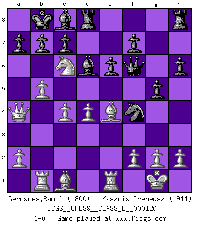 Last move : 1-0 2010 August 23 14:15:56 [Event "FICGS__CHESS__CLASS_B__000120"] [Site "FICGS"] [Date "2010.08.21"] [Round "1"] [White "Germanes,Ramil"] [Black "Kasznia,Ireneusz"] [Result "1-0"] [WhiteElo "1800"] [BlackElo "1911"] 1.e4 e6 2.d4 d5 3.Nc3 dxe4 4.Nxe4 Nf6 5.Nxf6+ Qxf6 6.Nf3 h6 7.Bd3 Nc6 8.O-O Bd7 9.c3 O-O-O 10.b4 Ne7 11.b5 Nd5 12.c4 Nf4 13.Be4 Kb8 14.Rb1 Be7 15.Re1 g5 16.Qa4 Bc8 17.Ne5 Bd6 18.Nc6+ 1-0 French : Rubinstein variation Kingside Castling by player White (move 8) Queenside Castling by player Black (move 9) Player White won this chess game. Follow this game move after move (download)Chess is the art which expresses the science of logic. (Mikhail Botvinnik) Lisa Lane, amerikanische Schachmeisterin, hatte Fischer einmal als stärksten lebenden Spieler bezeichnet. Antwort: Das ist richtig, aber Lisa Lane ist eigentlich nicht in der Lage, das zu beurteilen. (Robert James Fischer) De todos mis libros Rusos, la defensa contiene y difunde el 'calor' mas grande que pudiese verse extraño al observar lo supremamente abstracto que el Ajedrez supuestamente es. (Vladimir Nabokov) L'action d'une oeuvre littéraire se déroule sur un champ de bataille. Les masques et les types du drame moderne correspondent aux pièces du jeu d'échecs. L'intrigue correspond aux coups et aux gambits, c'est à dire aux techniques du jeu telles qu'utilisées et interprétées par les joueurs. Les tactiques et les péripéties [mouvements] correspondent aux coups exécutés par l'adversaire. (Viktor Shklovsky) Beta. Software undergoes beta testing shortly before it's released. Beta is latin for still doesn't work. (Anonymous)