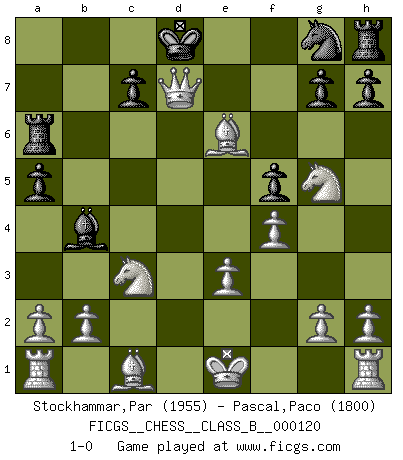 Last move : 1-0 2010 August 29 20:1:20 [Event "FICGS__CHESS__CLASS_B__000120"] [Site "FICGS"] [Date "2010.08.21"] [Round "1"] [White "Stockhammar,Par"] [Black "Pascal,Paco"] [Result "1-0"] [WhiteElo "1955"] [BlackElo "1800"] 1.f4 d5 2.Nf3 Nc6 3.e3 f6 4.d4 f5 5.c4 e6 6.Nc3 dxc4 7.Bxc4 Na5 8.Qa4+ Nc6 9.Ng5 Bb4 10.Bxe6 a5 11.d5 Qe7 12.dxc6 Ra6 13.cxb7 Bd7 14.b8Q+ Qd8 15.Qxd8+ Kxd8 16.Qxd7+ 1-0 Bird's Opening Promotion Queen by player White (move 14) Player White won this chess game. Follow this game move after move (download)Chess is a fairy tale of 1001 blunders. (Savielly Tartakower) Wie bekannt hörte Morphy 1859 auf, Schach zu spielen. Seine Enttäuschung galt nicht so sehr dem Schach, wie den Schachspielern. (Robert James Fischer) El Ajedrez es tan interesante por sí solo, que no es necesario un interés monetario para persuadir a una persona a que lo practique; por lo tanto, nunca se juega por dinero. (Benjamin Franklin) On peut tirer plus d'utilité d'une partie perdue que de 100 parties gagnées. (Capablanca) Computers make it easier to do a lot of things, but most of the things they make it easier to do don't need to be done. (Andy Rooney)