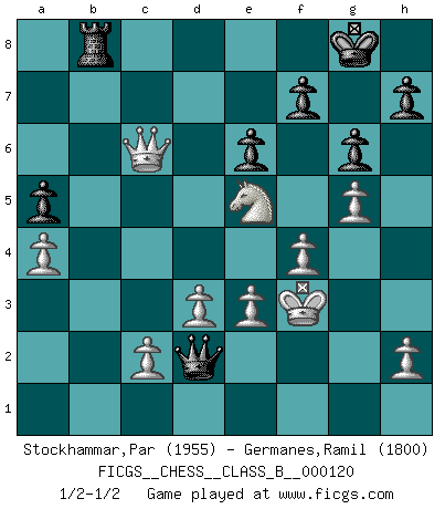 Last move : 1/2-1/2 2010 October 1 12:59:58 [Event "FICGS__CHESS__CLASS_B__000120"] [Site "FICGS"] [Date "2010.08.21"] [Round "1"] [White "Stockhammar,Par"] [Black "Germanes,Ramil"] [Result "1/2-1/2"] [WhiteElo "1955"] [BlackElo "1800"] 1.f4 d5 2.Nf3 Nf6 3.e3 g6 4.b4 Bg7 5.Bb2 O-O 6.Be2 c6 7.O-O a5 8.b5 cxb5 9.Bxb5 Nc6 10.Na3 Bf5 11.Be2 Rc8 12.Rb1 Qd7 13.Bc3 Bg4 14.Nb5 Ne4 15.Bxg7 Kxg7 16.d3 Bxf3 17.Bxf3 Nf6 18.Qe2 Rfd8 19.a4 e6 20.g4 d4 21.Bxc6 bxc6 22.Nxd4 Nd5 23.Nf3 Nc3 24.Qd2 Nxb1 25.Rxb1 Qc7 26.Qc3+ Kg8 27.Ne5 Rb8 28.Rxb8 Rxb8 29.g5 Qb6 30.Kf2 Qb4 31.Qxc6 Qd2+ 32.Kf3 1/2-1/2 Bird's Opening Kingside Castling by player Black (move 5) Kingside Castling by player White (move 7) This chess game ended in a draw. Follow this game move after move (download)In a gambit you give up a Pawn for the sake of getting a lost game. (Samuel Standige Boden) Ich trinke, ich rauche, ich spiele, ich liebe Frauen aber Fernschach ist ein Laster, das ich nicht habe. (Mikhail Nekhemyevich Tal) El pensamiento metódico es mas útil en el Ajedrez que la inspiración. (C. J. S. Purdy) Aux échecs, les retours au sommet sont rares : les dommages psychologiques consécutifs à une défaite sont trop sévères. (Daily Telegraph) Work expands to fill the time available. (C. Northcote Parkinson, in Parkinson's Laws)