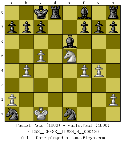Last move : 0-1 2010 December 7 10:23:34 [Event "FICGS__CHESS__CLASS_B__000120"] [Site "FICGS"] [Date "2010.08.21"] [Round "1"] [White "Pascal,Paco"] [Black "Valle,Paul"] [Result "0-1"] [WhiteElo "1800"] [BlackElo "1800"] 1.Nf3 e5 2.Nc3 d5 3.Nxe5 d4 4.Ne4 Qd5 5.f4 Qxe4 6.d3 Qd5 7.e4 dxe3 8.Bxe3 Ne7 9.c4 Qe6 10.c5 Nd5 11.Qg4 Nxe3 12.Qh3 Nc2+ 13.Kd1 Nxa1 14.d4 Nc6 15.Bc4 Qxc4 16.Nxc4 Bxh3 17.Re1+ Be6 18.Ne5 Nxd4 19.g4 O-O-O 20.b4 Ndc2 21.Kc1 Nxe1 0-1 Reti Opening Queenside Castling by player Black (move 19) Player Black won this chess game. Follow this game move after move (download)The Chess pieces are the block alphabet which shapes thoughts; and these thoughts, although making a visual design on the chessboard, express their beauty abstractly, like a poem. (Marcel Duchamp) Aljechin war kein Nazi. Er war ein Opportunist. Ein schrecklicher Mann. Er liebte Geld über alles und würde für Geld ein Jude, ein Katolik oder ein Protestant werden. (Miguel Najdorf) Preferería tener un Peón que un dedo. (Reuben Fine) Karpov est une pièce de musée. (Garry Kasparov) It is the aim of the modern school, not to treat every position according to one general law, but according to the principle inherent in the position. (Richard Reti)