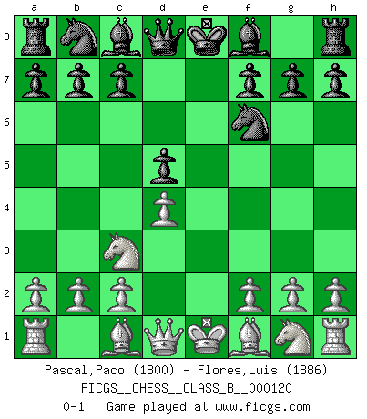 Last move : 0-1 2010 October 11 9:40:53 [Event "FICGS__CHESS__CLASS_B__000120"] [Site "FICGS"] [Date "2010.08.21"] [Round "1"] [White "Pascal,Paco"] [Black "Flores,Luis"] [Result "0-1"] [WhiteElo "1800"] [BlackElo "1886"] 1.e3 e5 2.d4 exd4 3.exd4 d5 4.Nc3 Nf6 0-1 This chess game has been lost on time (started : 2010.08.21 13:43:54) Van't Kruijs Opening Player Black won this chess game. Follow this game move after move (download)My God, Bobby Fischer plays so simply. (Alexei Suetin) Es ist peinlich, dass ich nie Weltmeister wurde. Es wäre leicht, Leonid Breschnjew als Ursache vorzuschieben, dessen Apparat den Vorzeigekommunisten Anatoli Karpow in allem unterstützte. Aber Garri Kasparow zum Beispiel, der ebenfalls von den Sowjets unerwünscht war, hat trotz der Widerstände den WM-Titel erobert. (Viktor Kortschnoi) En el tablero, la mentira e hipocresía no sobreviven mucho. (Emanuel Lasker) Les Echecs représentent une sphère d'idées créatrices basée sur la volonté des deux protagonistes. (Smyslov) Hold em is to stud what chess is to checkers. (Johnny Moss)