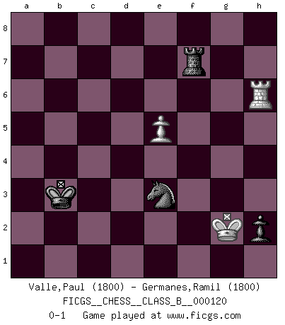 Last move : 0-1 2010 November 24 16:19:29 [Event "FICGS__CHESS__CLASS_B__000120"] [Site "FICGS"] [Date "2010.08.21"] [Round "1"] [White "Valle,Paul"] [Black "Germanes,Ramil"] [Result "0-1"] [WhiteElo "1800"] [BlackElo "1800"] 1.Nh3 d5 2.g3 e5 3.f4 e4 4.Bg2 Nc6 5.c4 dxc4 6.Qa4 f5 7.Qxc4 Nf6 8.Nc3 Qd4 9.Qxd4 Nxd4 10.Kd1 Bd7 11.e3 Nb5 12.a4 Nxc3+ 13.bxc3 Be7 14.Nf2 O-O-O 15.Kc2 h5 16.h4 Be6 17.a5 Rh6 18.Bf1 Nd7 19.Ba3 Bxa3 20.Rxa3 Nc5 21.Nd1 Rg6 22.Rg1 Bd5 23.Nb2 Rgd6 24.Rg2 Nd3 25.Ra1 b5 26.Rh2 Nxb2 27.Kxb2 a6 28.Kc2 Bf7 29.Rd1 Kd7 30.Bh3 g6 31.Bf1 Rc6 32.Ra1 Kd6 33.Kd1 Bb3+ 34.Ke1 Ke6 35.Be2 Bc4 36.Rh1 Bxe2 37.Kxe2 Rcd6 38.Ra2 Kd5 39.Rc1 Ke6 40.Rh1 Rc6 41.R2a1 Rd3 42.Ra2 Rcd6 43.Rb1 c5 44.Rc1 Rd7 45.Ke1 Rb7 46.Rb2 Kd5 47.Kd1 b4 48.R2b1 c4 49.cxb4 Ra3 50.Rc2 Ra4 51.Rcb2 Kc6 52.Kc2 Kb5 53.Kd1 Rd7 54.Ke1 Rd3 55.Ke2 R4a3 56.Rc2 Rdb3 57.Rh1 Ra4 58.g4 fxg4 59.Rhc1 Raxb4 60.f5 gxf5 61.Rf1 Rb1 62.Rxf5+ Ka4 63.Rg5 Rh1 64.Kf2 Rxh4 65.Kg2 Kb3 66.Rc3+ Ka2 67.Rg6 Rb2 68.Rxa6 Rxd2+ 69.Kg3 Rh3+ 70.Kf4 g3 71.Rg6 g2 72.a6 Rf3+ 73.Kxe4 Rf8 74.Rxc4 h4 75.Rb4 h3 76.Rgb6 Re8+ 77.Kf3 g1N 78.Kf4 Rf2+ 79.Kg4 Rg2+ 80.Kf5 Rf8+ 81.Ke6 Rg6+ 82.Kd5 Rxb6 83.Rxb6 Rh8 84.Rg6 Nf3 85.a7 Ra8 86.Ke4 Nd2+ 87.Kf4 h2 88.Rh6 Nf1 89.Kf3 Rxa7 90.e4 Kb3 91.e5 Rf7+ 92.Kg2 Ne3+ 0-1 Amar (Paris) Opening Queenside Castling by player Black (move 14) 10 pieces endgame at move 74 : White KRRPP , Black KRRPP WHITE : King + 2 Rooks 2 Pawns BLACK : King + 2 Rooks 2 Pawns Promotion Knight by player Black (move 77) 9 pieces endgame at move 82 : White KRPP , Black KRRNP WHITE : King + 1 Rook 2 Pawns BLACK : King + 2 Rooks 1 Knight 1 Pawn 8 pieces endgame at move 83 : White KRPP , Black KRNP WHITE : King + 1 Rook 2 Pawns BLACK : King + 1 Rook 1 Knight 1 Pawn 7 pieces endgame at move 89 : White KRP , Black KRNP WHITE : King + 1 Rook 1 Pawn BLACK : King + 1 Rook 1 Knight 1 Pawn Player Black won this chess game. Follow this game move after move (download)In Chess, just as in life, today's bliss may be tomorrow's poison. (Assaic) Verschiedene, sehr schätzbare und im Laufe des Lebens nützliche Eigenschaften des Geistes können durch das Schachspiel erworben und gekräftigt werden, so dass sie zu Gewohnheiten werden, die uns nie im Stich lassen. (Benjamin Franklin) El Ajedrez es una hermosa aventura. (Bent Larsen) Les Cavaliers se révèlent fort utiles dans les positions fermées. D'habitude, les Fous sont un peu plus forts que les Cavaliers dans les positions ouvertes. Qu'on le veuille ou non, il restera toujours des exceptions ! Always two there are. No more no less. A master, and an apprentice. (Master Yoda in Star Wars ep.1)
