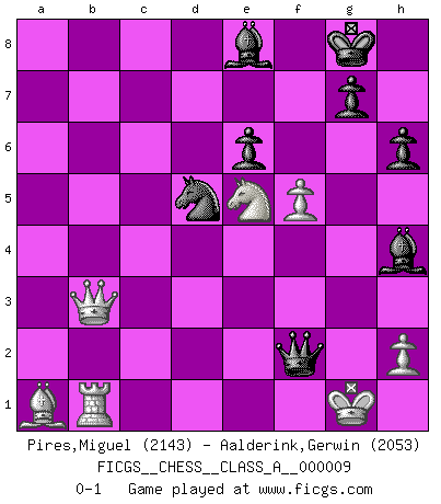 Last move : 0-1 2007 September 30 4:37:9 [Event "FICGS__CHESS__CLASS_A__000009"] [Site "FICGS"] [Date "2006.11.18"] [Round "1"] [White "Pires,Miguel"] [Black "Aalderink,Gerwin"] [Result "0-1"] [WhiteElo "2143"] [BlackElo "2053"] 1.e4 c6 2.d4 d5 3.Nc3 dxe4 4.Nxe4 Nd7 5.Ng5 Ngf6 6.Bd3 e6 7.N1f3 Bd6 8.O-O h6 9.Ne4 Nxe4 10.Bxe4 Qc7 11.c4 Nf6 12.Bc2 O-O 13.c5 Be7 14.Ne5 Rd8 15.b4 a5 16.Bb2 axb4 17.Qf3 Bd7 18.a3 bxa3 19.Rxa3 Rxa3 20.Qxa3 Nd5 21.Ra1 b5 22.cxb6 Qxb6 23.Qd3 f5 24.Rb1 Qc7 25.Qf3 Be8 26.g4 c5 27.dxc5 Qxc5 28.Bb3 Rb8 29.gxf5 Bh4 30.Ba1 Rxb3 31.Qxb3 Qxf2+ 0-1 This chess game has been lost on time (started : 2006.11.18 10:41:38) Caro-Kann : Steinitz variation Kingside Castling by player White (move 8) Kingside Castling by player Black (move 12) Player Black won this chess game. Follow this game move after move (download)Spassky will not be psyched out by Fischer. (Mike Goodall) Heutzutage gewinnt im Turnier nicht derjenige Spieler, der weitreichende Pläne entwirft, sondern einfach jener, der Zug um Zug kämpft. (David Bronstein) No todos los artistas son jugadores de Ajedrez, pero todos los jugadores de Ajedrez son artistas. (Marcel Duchamp) Les échecs, c'est la lutte contre l'erreur. (Johannes Zukertort) Life is verb, not a noun. (Charlotte Perkins Gilman)