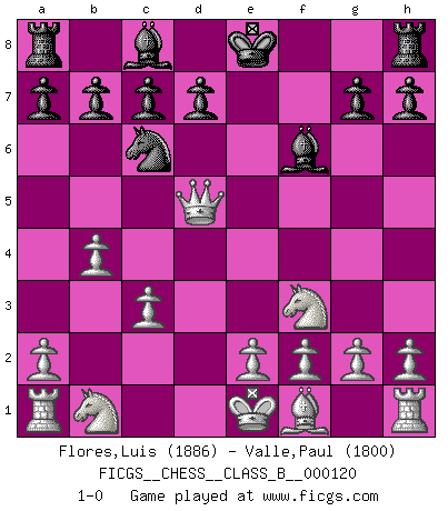 Last move : 1-0 2010 October 6 12:44:50 [Event "FICGS__CHESS__CLASS_B__000120"] [Site "FICGS"] [Date "2010.08.21"] [Round "1"] [White "Flores,Luis"] [Black "Valle,Paul"] [Result "1-0"] [WhiteElo "1886"] [BlackElo "1800"] 1.d4 e5 2.dxe5 Nc6 3.Nf3 Qe7 4.Bg5 Qc5 5.Be3 Qa5+ 6.Qd2 Bb4 7.c3 Be7 8.Bd4 f6 9.b4 Qd5 10.exf6 Nxf6 11.Bxf6 Bxf6 12.Qxd5 1-0 Queen's pawn : Charlick (Englund) gambit Player White won this chess game. Follow this game move after move (download)There's never before been a Chess player with such a thorough knowledge of the intricacies of the game and such an absolutely indomitable will to win. I think Bobby is the greatest player that ever lived. (Lisa Lane) Ich bin stolz ein Bulgare zu sein. (Veselin Topalov) Uno no tiene que jugar muy bien, es suficiente jugar mejor que el oponente. (Siegbert Tarrasch) Il (Jacob Murray) ne joue pas pour le bon coup, mais pour le meilleur. (Eloi Relange) Kids, you tried your best and you failed miserably. The lesson is, never try. (Simpsons)