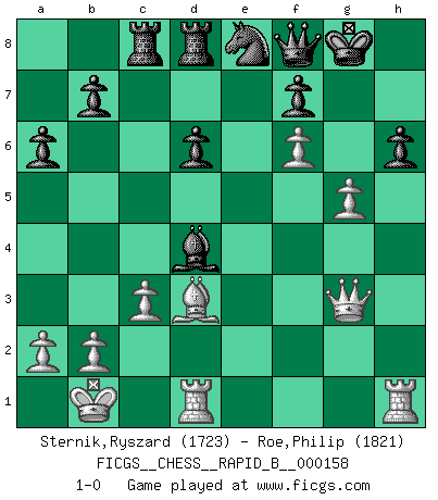 Last move : 1-0 2010 October 7 15:23:56 [Event "FICGS__CHESS__RAPID_B__000158"] [Site "FICGS"] [Date "2010.08.21"] [Round "1"] [White "Sternik,Ryszard"] [Black "Roe,Philip"] [Result "1-0"] [WhiteElo "1723"] [BlackElo "1821"] 1.Nf3 d6 2.d4 g6 3.e4 Bg7 4.Nc3 a6 5.h4 Bg4 6.Be3 Nd7 7.Qd2 Bxf3 8.gxf3 Ngf6 9.O-O-O c6 10.Bd3 Qa5 11.Kb1 c5 12.Be2 Rc8 13.dxc5 Nxc5 14.f4 Na4 15.Nxa4 Qxa4 16.f3 O-O 17.c3 Rfd8 18.Rhg1 e6 19.f5 exf5 20.exf5 Qxh4 21.Rh1 Qa4 22.Bd4 Qe8 23.Bd3 Qf8 24.Qg5 h6 25.Qg3 g5 26.f4 Ne8 27.fxg5 Bxd4 28.f6 1-0 Reti Opening Queenside Castling by player White (move 9) Kingside Castling by player Black (move 16) Player White won this chess game. Follow this game move after move (download)Examine moves that smite! A good eye for smites is far more important than a knowledge of strategical principles. (Purdy) Es tut gut, die Entwicklungsperiode von, [...] demokratischem Geist durchdringen zu lassen. Wie undemokratisch wäre es doch beispielsweise, den einen Offizier große Spaziertouren vornehmen zu lassen, während die anderen zu Hause säßen und sich entsetzlich langweilten. (Aaron Nimzowitsch) El Ajedrez es un expediente tonto que hace creer a la gente inactiva que hacen una cosa muy astuta cuando solamente estan perdiendo su tiempo. (George Bernard Shaw) Les échecs, c'est l'imagination. (David Bronstein) Political correctness is subjecting us to gross incompetence. (Johann Piek)