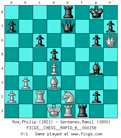 Last move : 0-1 2010 September 24 10:45:22 [Event "FICGS__CHESS__RAPID_B__000158"] [Site "FICGS"] [Date "2010.08.21"] [Round "1"] [White "Roe,Philip"] [Black "Germanes,Ramil"] [Result "0-1"] [WhiteElo "1821"] [BlackElo "1800"] 1.Nc3 e5 2.Nf3 Nc6 3.d4 exd4 4.Nxd4 Bc5 5.Nf5 g6 6.Be3 b6 7.Bxc5 bxc5 8.Ng3 Nf6 9.e4 Rb8 10.f4 Nd4 11.b3 O-O 12.Bc4 c6 13.e5 d5 14.Bd3 Ng4 15.Qd2 Qe7 16.Nce2 f6 17.h3 fxe5 18.hxg4 exf4 19.c3 fxg3 20.cxd4 Bxg4 21.Rc1 Rbe8 22.Rxc5 Rf2 23.Rc2 Rxg2 24.Kd1 Rf2 25.Re1 g2 26.Qh6 Rf1 0-1 Dunst (Sleipner-Heinrichsen) Opening Kingside Castling by player Black (move 11) Player Black won this chess game. Follow this game move after move (download)Your body has to be in top condition. Your Chess deteriorates as your body does. You can't separate body from mind. (Bobby Fischer) Offener Brief an US-Präsident Bush anlässlich der Verhaftung Bobby Fishers: Verhaften Sie mich. Stecken Sie mich in dieselbe Zelle wie Bobby Fisher und geben Sie uns ein Schachspiel mit. (Boris Vassilievich Spassky) Aún deseo matar a Fischer. (Boris Spassky) Comme les marins qui ont mille raisons différentes d'aller en mer, les joueurs d'échecs en ont tout autant avant de s'installer devant une table et jouer... (Vincent Bertignac, philosophe) Good decisions come from experience, and experience comes from bad decisions. (Anonymous)