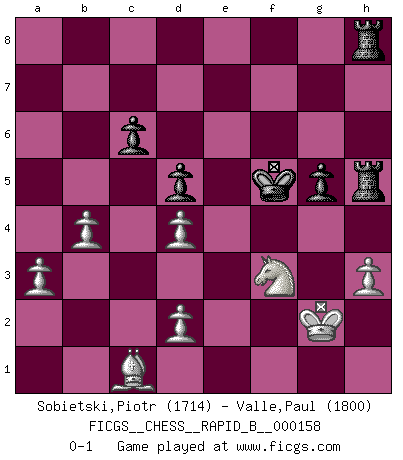 Last move : 0-1 2010 November 19 10:21:17 [Event "FICGS__CHESS__RAPID_B__000158"] [Site "FICGS"] [Date "2010.08.21"] [Round "1"] [White "Sobietski,Piotr"] [Black "Valle,Paul"] [Result "0-1"] [WhiteElo "1714"] [BlackElo "1800"] 1.c4 b5 2.cxb5 a6 3.e3 e5 4.Qh5 Bd6 5.Bc4 Qe7 6.Nf3 axb5 7.Bxb5 c6 8.Be2 e4 9.Nd4 g6 10.Qh3 Be5 11.O-O Na6 12.f4 Bf6 13.Nc3 Nb4 14.f5 d5 15.Rb1 Bxd4 16.exd4 Bxf5 17.g4 Be6 18.Qg3 h5 19.gxh5 Nh6 20.a3 Nd3 21.Kh1 Ng4 22.Bxg4 Bxg4 23.Qxg4 Rxh5 24.b4 Qd6 25.h3 f5 26.Qg2 Kd7 27.Ne2 Rah8 28.Ng1 g5 29.Rxf5 Ne1 30.Qh2 Qe6 31.Re5 Qg4 32.Rb3 Nf3 33.Rxf3 exf3 34.Re7+ Kxe7 35.Qc7+ Qd7 36.Qxd7+ Kxd7 37.Nxf3 Ke6 38.Kg2 Kf5 0-1 This chess game has been lost on time (started : 2010.08.21 14:41:12) English : Jaenisch gambit Kingside Castling by player White (move 11) Player Black won this chess game. Follow this game move after move (download)Chess is a part of culture and if a culture is declining then Chess too will decline. (Mikhail Botvinnik) Ich würde mich als ganz normalen Jungen bezeichnen [Im Alter von 12]. (Sergej Karjakin) Si un gobernante no entiende al Ajedrez, ¿como puede governar él un reinado?. (El Rey Khusros II) Tous ces prétendus hommes politiques sont les pions, les Cavaliers, les Tours ou les Fous d'une partie d'échecs qui se jouera tant qu'un hasard ne renversera pas l'échiquier. (Honoré de Balzac) Men never do evil so completely and cheerfully as when they do it from religious conviction. (Blaise Pascal)