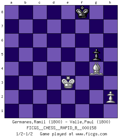 Last move : 1/2-1/2 2010 September 20 4:6:29 [Event "FICGS__CHESS__RAPID_B__000158"] [Site "FICGS"] [Date "2010.08.21"] [Round "1"] [White "Germanes,Ramil"] [Black "Valle,Paul"] [Result "1/2-1/2"] [WhiteElo "1800"] [BlackElo "1800"] 1.e4 f5 2.exf5 Nf6 3.d4 d5 4.Bd3 c5 5.c3 c4 6.Bc2 e6 7.fxe6 Bd6 8.Qe2 Qe7 9.Nf3 Nc6 10.O-O O-O 11.Re1 Re8 12.b3 Bxe6 13.bxc4 dxc4 14.Bg5 Bd5 15.Qxe7 Bxe7 16.Nbd2 b5 17.Ne5 Nd7 18.Bxe7 Ncxe5 19.a4 Rxe7 20.dxe5 bxa4 21.Rxa4 Rxe5 22.Rxe5 Nxe5 23.Ra5 Rd8 24.Nf1 Nc6 25.Rc5 Ne7 26.Rc7 Kf8 27.Rxa7 Be6 28.Ra4 Rb8 29.Ne3 g6 30.f3 Rb2 31.Rb4 Ra2 32.Be4 Ra3 33.Nxc4 Rxc3 34.Ne5 Kg7 35.Rb7 Kf6 36.Nd7+ Kf7 37.g4 h5 38.Kf2 Bxd7 39.Rxd7 hxg4 40.fxg4 Rh3 41.Kg2 Re3 42.Bd5+ Ke8 43.Rd6 g5 44.Re6 Rxe6 45.Bxe6 Nc6 46.Bf5 Ne5 47.Kf2 Nxg4+ 48.Bxg4 Kf8 49.Ke3 1/2-1/2 Fred Kingside Castling by player White (move 10) Kingside Castling by player Black (move 10) 10 pieces endgame at move 39 : White KRBPP , Black KRNPP WHITE : King + 1 Rook 1 Bishop 2 Pawns BLACK : King + 1 Rook 1 Knight 2 Pawns 9 pieces endgame at move 40 : White KRBPP , Black KRNP WHITE : King + 1 Rook 1 Bishop 2 Pawns BLACK : King + 1 Rook 1 Knight 1 Pawn 8 pieces endgame at move 44 : White KBPP , Black KRNP WHITE : King + 1 Bishop 2 Pawns BLACK : King + 1 Rook 1 Knight 1 Pawn 7 pieces endgame at move 45 : White KBPP , Black KNP WHITE : King + 1 Bishop 2 Pawns BLACK : King + 1 Knight 1 Pawn 6 pieces endgame at move 47 : White KBP , Black KNP WHITE : King + 1 Bishop 1 Pawn BLACK : King + 1 Knight 1 Pawn 5 pieces endgame at move 48 : White KBP , Black KP WHITE : King + 1 Bishop 1 Pawn BLACK : King + 1 Pawn This chess game ended in a draw. Follow this game move after move (download)Human affairs are like a Chess game: only those who do not take it seriously can be called good players. (Hung Tzu Ch'eng) Matt entspricht nicht immer den Tatsachen. (Savielly Grigorievitsch Tartakower) La maestría del Ajedrez consiste esencialmente en analizar posiciónes de Ajedrez con precisión. (Mikhail Botvinnik) Vous n'êtes pas toujours obligé de jouer le meilleur coup. Un coup doit être actif, entreprenant, correct et beau ! (David Bronstein) Life is the sum of all your choices. (Albert Camus)