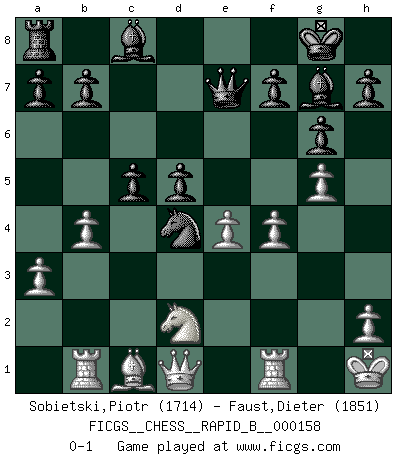 Last move : 0-1 2010 November 5 9:53:14 [Event "FICGS__CHESS__RAPID_B__000158"] [Site "FICGS"] [Date "2010.08.21"] [Round "1"] [White "Sobietski,Piotr"] [Black "Faust,Dieter"] [Result "0-1"] [WhiteElo "1714"] [BlackElo "1851"] 1.c4 g6 2.d4 c5 3.d5 d6 4.e4 Bg7 5.Nc3 Nf6 6.Nf3 O-O 7.Be2 e6 8.O-O Re8 9.Nd2 Na6 10.Kh1 Nc7 11.g4 exd5 12.cxd5 Qe7 13.g5 Nfxd5 14.Nxd5 Nxd5 15.Bb5 Nb4 16.Bxe8 Qxe8 17.a3 Nc6 18.Rb1 Nd4 19.b4 Qe7 20.f4 d5 0-1 This chess game has been lost on time (started : 2010.08.21 14:41:12) English Opening Kingside Castling by player Black (move 6) Kingside Castling by player White (move 8) Player Black won this chess game. Follow this game move after move (download)The enormous mental resilience, without which no Chess player can exist, was so much taken up by Chess that he could never free his mind of this game. (Albert Einstein) Es war undenkbar für die Behörden, dass ein sowjetischer Großmeister auf diese Art und Weise [Fischer-Taimanov 6:0] verliert, ohne dass es eine politischer Erklärung dafür gäbe. (Mark Taimanov) Nunca antes ha habido un jugador de Ajedrez con tal conocimiento a fondo de las complejidades del juego y una inmensa voluntad absolutamente indomable de ganar. Yo pienso que Fischer es el jugador mas grande que jamás haya existido. (Lisa Lane) Les Cavaliers se révèlent fort utiles dans les positions fermées. D'habitude, les Fous sont un peu plus forts que les Cavaliers dans les positions ouvertes. Qu'on le veuille ou non, il restera toujours des exceptions ! Luck has a peculiar habit of favoring those who don't depend on it. (Author unknown)