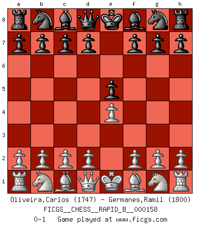 Last move : 0-1 2010 September 21 20:59:35 [Event "FICGS__CHESS__RAPID_B__000158"] [Site "FICGS"] [Date "2010.08.21"] [Round "1"] [White "Oliveira,Carlos"] [Black "Germanes,Ramil"] [Result "0-1"] [WhiteElo "1747"] [BlackElo "1800"] 1.e4 e5 0-1 This chess game has been lost on time (started : 2010.08.21 14:41:12) King's pawn game Player Black won this chess game. Follow this game move after move (download)It is the aim of the modern school, not to treat every position according to one general law, but according to the principle inherent in the position. (Richard Reti) Ich rechne überhaupt nicht voraus. Ich gewinne auch so. (Robert James Fischer) Muchos jugadores de Ajedrez se sorprendían cuando después de la partida, Fischer explicaba con calma: 'Yo ya había analizado esta posibilidad' en una posición en la cual yo creía que no era posible de prever desde la apertura. (Mikhail Tal) Il (Jacob Murray) ne joue pas pour le bon coup, mais pour le meilleur. (Eloi Relange) First of all, we have to go back to the classical time control. (Anatoly Karpov)