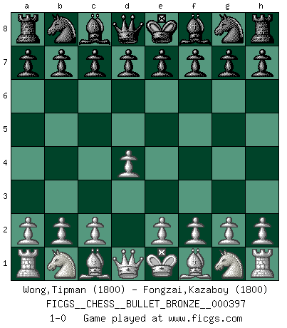 Last move : 1-0 2010 August 21 22:42:29 [Event "FICGS__CHESS__BULLET_BRONZE__000397"] [Site "FICGS"] [Date "2010.08.21"] [Round "1"] [White "Wong,Tipman"] [Black "Fongzai,Kazaboy"] [Result "1-0"] [WhiteElo "1800"] [BlackElo "1800"] 1.d4 1-0 This chess game has been lost on time (started : 2010.08.21 15:40:52) Queen's pawn Player White won this chess game. Follow this game move after move (download)Place the contents of the Chess box in a hat, shake them up vigorously, pour them on the board from a height of two feet, and you get the style of Steinitz. (H. E. Bird) Jeder leidlich begabte Spieler, er braucht keineswegs hervorragend veranlagt zu sein, kann es zum Meister bringen. Aber das ist ja auch gar nicht nötig! Der richtige Standpunkt ist es, zu seinem Vergnügen zu spielen, und man glaube ja nicht, dass der Genuss proportional dem Können sei. (Siegbert Tarrasch) El Ajedrez era la lengua materna de Capablanca. (Reti) A chaque perte on perd un peu de soi. (Joël Lautier) Computers have lots of memory but no imagination. (Anonymous)