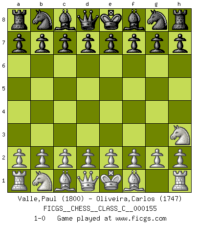 Last move : 1-0 2010 October 2 9:21:6 [Event "FICGS__CHESS__CLASS_C__000155"] [Site "FICGS"] [Date "2010.08.22"] [Round "1"] [White "Valle,Paul"] [Black "Oliveira,Carlos"] [Result "1-0"] [WhiteElo "1800"] [BlackElo "1747"] 1.Nh3 1-0 This chess game has been lost on time (started : 2010.08.22 21:46:35) Amar (Paris) Opening Player White won this chess game. Follow this game move after move (download)Without error there can be no brilliancy. (Emanuel Lasker) Es gibt nur zwei wahre Schachgenies - das andere war Wilhelm Steinitz, der Weltmeister von 1872 bis 1894. (Robert James Fischer) Bobby Fischer es el jugador de Ajedrez mas grande que jamás haya existido. (Ken Smith) Horreur, mais aussi harmonie suprême : qu'y avait-il en effet au monde en dehors des échecs ? Le brouillard, l'inconnu, le non-être... (Vladimir Nabokov) The human is the only animal species whose members are able to talk themselves into difficulties that would not otherwise exist. (Wendell Johnson)