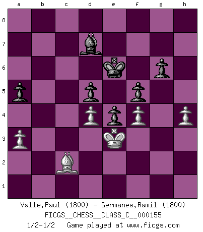 Last move : 1/2-1/2 2010 November 4 22:59:49 [Event "FICGS__CHESS__CLASS_C__000155"] [Site "FICGS"] [Date "2010.08.22"] [Round "1"] [White "Valle,Paul"] [Black "Germanes,Ramil"] [Result "1/2-1/2"] [WhiteElo "1800"] [BlackElo "1800"] 1.Nh3 d5 2.g3 e5 3.f4 e4 4.Bg2 Nc6 5.c4 dxc4 6.Nc3 f5 7.Qa4 Nf6 8.Qxc4 Qd4 9.Qxd4 Nxd4 10.Kd1 Bd7 11.e3 Nf3 12.Ke2 O-O-O 13.Ng1 Nxg1+ 14.Rxg1 c6 15.b3 Bb4 16.Bb2 Be6 17.Rac1 Rd3 18.h3 Rhd8 19.Rc2 Kb8 20.Rd1 Ka8 21.Bf1 Bf7 22.Ke1 R3d7 23.Be2 g6 24.g4 Ne8 25.Na4 Nc7 26.Bd4 Rxd4 27.exd4 Ne6 28.d5 cxd5 29.Rdc1 Kb8 30.Nc5 Bxc5 31.gxf5 gxf5 32.Rxc5 Nxc5 33.Rxc5 Rd6 34.d4 Rh6 35.Rc3 a6 36.Kf2 Be8 37.Rg3 Rg6 38.Rxg6 hxg6 39.h4 Kc7 40.Bd1 Kd6 41.Ke3 b6 42.b4 a5 43.bxa5 bxa5 44.a3 Bb5 45.Bc2 Ke6 46.Bb3 Bc6 47.Bc2 Bd7 1/2-1/2 Amar (Paris) Opening Queenside Castling by player Black (move 12) This chess game ended in a draw. Follow this game move after move (download)The combination player thinks forward; he starts from the given position, and tries the forceful moves in his mind. (Emanuel Lasker) Ich las kürzlich ein Buch von Nietzsche. Er sagte Religion verdumme nur die Menschen. Ich stimme zu. (Robert James Fischer) Cuando le juegas a Fischer, no es una cuestion de si vas a ganar o perder. Es una cuestion de si vas a sobrevivir. (Boris Spassky) J'apprécie les joueurs d'est-indienne, c'est grâce à eux que je nourris ma famille depuis tant d'années. (Petrosian) Fortune favours the audacious. (Desiderius Erasmus)