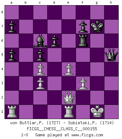 Last move : 1-0 2011 February 9 10:18:34 [Event "FICGS__CHESS__CLASS_C__000155"] [Site "FICGS"] [Date "2010.08.22"] [Round "1"] [White "von Buttlar,Paul"] [Black "Sobietski,Piotr"] [Result "1-0"] [WhiteElo "1727"] [BlackElo "1714"] 1.c4 e5 2.Nc3 Nf6 3.Nf3 Nc6 4.d4 exd4 5.Nxd4 Bb4 6.Bg5 h6 7.Bh4 O-O 8.Rc1 Re8 9.e3 Nxd4 10.Qxd4 g5 11.Bg3 Ne4 12.Be2 d6 13.Bf3 Bxc3+ 14.bxc3 Qe7 15.O-O b6 16.Rfe1 Rb8 17.Bd1 c5 18.Qd3 Bf5 19.Qd5 Qf6 20.f3 Nxg3 21.hxg3 Re5 22.Qd2 Rd8 23.e4 Bd7 24.Bc2 Re6 25.g4 Qe5 26.Kf2 Rf6 27.Kg1 Bc6 28.a4 Kg7 29.a5 Rh8 30.Bd1 bxa5 31.Ra1 h5 32.gxh5 Rxh5 33.f4 gxf4 34.Bxh5 Qxh5 35.Qe2 f3 36.gxf3 1-0 English Opening Kingside Castling by player Black (move 7) Kingside Castling by player White (move 15) Player White won this chess game. Follow this game move after move (download)Adequate compensation for a sacrifice is having a sound combination leading to a winning position; adequate compensation for a blunder is having your opponent snatch defeat from the jaws of victory. (Bruce A. Moon) Schach ist gnadenlos. Du mußt bereit sein zu töten. (Nigel Short) El Ajedrez es en su esencia, un juego. En su forma, un arte. Y en su ejecución, una ciencia. (Baron Tassilo) Tout change constamment, y compris dans le monde des Echecs. (Botvinnik) Life is the sum of all your choices. (Albert Camus)