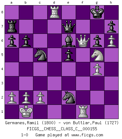 Last move : 1-0 2010 September 2 12:53:44 [Event "FICGS__CHESS__CLASS_C__000155"] [Site "FICGS"] [Date "2010.08.22"] [Round "1"] [White "Germanes,Ramil"] [Black "von Buttlar,Paul"] [Result "1-0"] [WhiteElo "1800"] [BlackElo "1727"] 1.e4 e6 2.d4 d5 3.Nc3 Nf6 4.Bg5 Be7 5.e5 Nfd7 6.Bxe7 Qxe7 7.f4 O-O 8.Nf3 c5 9.Nb5 a6 10.Nd6 cxd4 11.Qxd4 Nc6 12.Qe3 Rd8 13.O-O-O f6 14.h4 fxe5 15.fxe5 b6 16.h5 Nc5 17.h6 g6 18.Be2 Rxd6 19.exd6 Qxd6 20.Rhf1 e5 21.Ng5 Bf5 22.g4 Be6 23.Qf3 Nd4 24.Qf6 Nxe2+ 25.Kb1 Ra7 26.Rxd5 Qe7 27.Rd8+ 1-0 French : Classical, Steinitz variation Kingside Castling by player Black (move 7) Queenside Castling by player White (move 13) Player White won this chess game. Follow this game move after move (download)The most important feature of the Chess position is the activity of the pieces. This is absolutely fundamental in all phases of the game: Opening, Middlegame and especially Endgame. The primary constraint on a piece's activity is the Pawn structure. (Michael Stean) Stelle das Brett so, daß die Sonne in die Augen deines Gegners scheint. (Ruy López) Bendita sea la memoria de aquel que dio al mundo este juego inmortal. (A. G. Gardiner) D'abord les bases : Jouez et étudiez, puis étudiez et jouez, ensuite jouez et étudiez, puis étudiez et jouez. Deuxièmement : Donnez toujours le meilleur de vous-même ! (Ken Smith) The problem with troubleshooting is that trouble shoots back. (Anonymous)