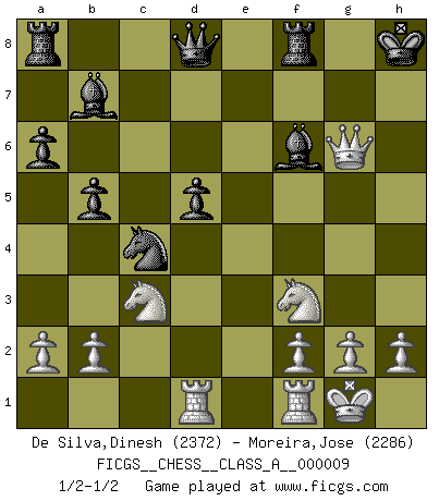 Last move : 1/2-1/2 2007 April 23 18:32:35 [Event "FICGS__CHESS__CLASS_A__000009"] [Site "FICGS"] [Date "2006.11.18"] [Round "1"] [White "De Silva,Dinesh"] [Black "Moreira,Jose"] [Result "1/2-1/2"] [WhiteElo "2372"] [BlackElo "2286"] 1.d4 d5 2.Nf3 Nf6 3.e3 e6 4.c4 dxc4 5.Bxc4 c5 6.O-O a6 7.Bb3 Nc6 8.Nc3 cxd4 9.exd4 Be7 10.Bg5 O-O 11.Qd2 Na5 12.Bc2 b5 13.Rad1 Bb7 14.Qf4 Nc4 15.Qh4 h5 16.d5 exd5 17.Bxf6 Bxf6 18.Qxh5 g6 19.Bxg6 fxg6 20.Qxg6+ Kh8 21.Qh6+ Kg8 22.Qg6+ Kh8 1/2-1/2 Queen's pawn game Kingside Castling by player White (move 6) Kingside Castling by player Black (move 10) This chess game ended in a draw. Follow this game move after move (download)When you absolutely don't know what to do anymore, it is time to panic. (John van der Wiel) Der Freibauer hat für mich eine Seele, genau wie der Mensch, Wünsche, die unerkannt in ihm schlummern, und Befürchtungen, von deren Existenz er selbst kaum ahnt. (Aaron Nimzowitsch) Cuando estes solo, cuando te sientas un extraño en el mundo, juega al Ajedrez. Esto levantará tu espiritu y será tu consejero de guerra. (Aristóteles) Il (Jacob Murray) ne joue pas pour le bon coup, mais pour le meilleur. (Eloi Relange) Two beer, or not two beer. (Unknown)