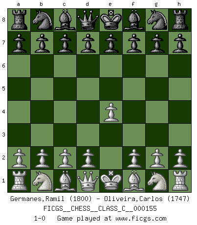 Last move : 1-0 2010 October 2 9:21:6 [Event "FICGS__CHESS__CLASS_C__000155"] [Site "FICGS"] [Date "2010.08.22"] [Round "1"] [White "Germanes,Ramil"] [Black "Oliveira,Carlos"] [Result "1-0"] [WhiteElo "1800"] [BlackElo "1747"] 1.e4 1-0 This chess game has been lost on time (started : 2010.08.22 21:46:35) King's pawn Opening Player White won this chess game. Follow this game move after move (download)Openings teach you openings. Endgames teach you chess ! (Stephan Gerzadowicz) Kombinieren und Schwarzhandel gehören verboten. (Savielly Grigorievitsch Tartakower) El tablero es el mundo, las piezas es el fenomeno del universo, las reglas del juego son lo que llamamos leyes de la naturaleza y el jugador del lado opuesto, se encuentra oculto a nuestra vista. (Thomas Huxley) Botvinnik disait en comparant les échecs à la musique: Il existe une science dont le but est l'étude de l'acoustique et des sons. Mais il y a aussi un art qui se sert de l'océan des sons : c'est la musique. De toute évidence, il en est de même pour la pensée. La logique est l'étude des lois de la réflexion et les échecs reflètent, en tant qu'art, le côté logique de la réflexion, sous la forme d'images artistiques... Extrait de Fischer - Spassky, Reykjavik 1972 par Alexander & F. Wyndham (Ed. Solar), p 37. Whenever people agree with me, I always feel I must be wrong. (Oscar Wilde)