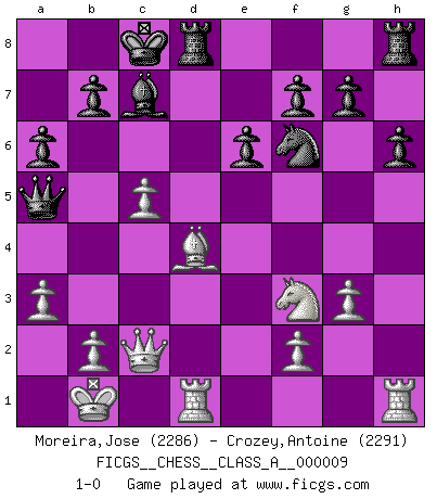 Last move : 1-0 2007 March 18 7:12:27 [Event "FICGS__CHESS__CLASS_A__000009"] [Site "FICGS"] [Date "2006.11.18"] [Round "1"] [White "Moreira,Jose"] [Black "Crozey,Antoine"] [Result "1-0"] [WhiteElo "2286"] [BlackElo "2291"] 1.e4 c6 2.d4 d5 3.Nc3 dxe4 4.Nxe4 Bf5 5.Ng3 Bg6 6.h4 h6 7.Nf3 Nd7 8.h5 Bh7 9.Bd3 Bxd3 10.Qxd3 e6 11.Bf4 Qa5+ 12.Bd2 Qc7 13.O-O-O Ngf6 14.Ne4 O-O-O 15.g3 Nxe4 16.Qxe4 Bd6 17.c4 c5 18.Bc3 cxd4 19.Nxd4 a6 20.Nf3 Nf6 21.Qe2 Qc5 22.Bd4 Qa5 23.a3 Bc7 24.Qc2 Nxh5 25.Kb1 Nf6 26.c5 1-0 Caro-Kann : Classical, 7...Nd7 Queenside Castling by player White (move 13) Queenside Castling by player Black (move 14) Player White won this chess game. Follow this game move after move (download)Openings teach you openings. Endgames teach you chess ! (Stephan Gerzadowicz) Es hat in meinem Leben Zeiten gegeben, in denen das Schachspiel, wenn nicht zum Lebenszweck, so doch zu einem regelrechten Lebensersatz geworden ist. Man fühlt sich in solchen Zeiten nicht so, als besäße man eine göttliche Gabe, sondern eher so, als sei man von ihr besessen. (Garry Kasparov) El tablero es el mundo, las piezas es el fenomeno del universo, las reglas del juego son lo que llamamos leyes de la naturaleza y el jugador del lado opuesto, se encuentra oculto a nuestra vista. (Thomas Huxley) Karpov est une pièce de musée. (Garry Kasparov) Even the best needles are not sharp at both ends. (Chinese proverb)