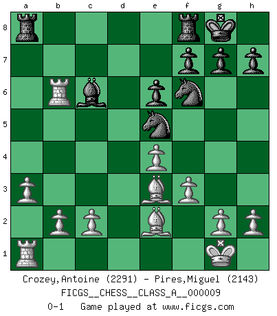 Last move : 0-1 2007 March 19 19:27:11 [Event "FICGS__CHESS__CLASS_A__000009"] [Site "FICGS"] [Date "2006.11.18"] [Round "1"] [White "Crozey,Antoine"] [Black "Pires,Miguel"] [Result "0-1"] [WhiteElo "2291"] [BlackElo "2143"] 1.e4 c5 2.Nf3 d6 3.d4 cxd4 4.Nxd4 Nf6 5.Nc3 a6 6.Be3 e6 7.Be2 Qc7 8.Qd2 b5 9.a3 Bb7 10.f3 Nc6 11.O-O Ne5 12.Rfd1 Be7 13.Ndxb5 axb5 14.Nxb5 Qc6 15.Nxd6+ Bxd6 16.Qxd6 Qxd6 17.Rxd6 O-O 18.Rb6 Bc6 0-1 This chess game has been lost on time (started : 2006.11.18 10:41:38) Sicilian : Najdorf, Byrne (English) attack Kingside Castling by player White (move 11) Kingside Castling by player Black (move 17) Player Black won this chess game. Follow this game move after move (download)Chess is the art which expresses the science of logic. (Mikhail Botvinnik) Ich glaube nicht an Psychologie, ich glaube an gute Züge. (Robert James Fischer) Los tropiezos estan todos ahí en el tablero, esperando que se cometan. (Savielly Tartakover) J'ai vu le vaincu d'Echecs jouer des années durant dans l'espoir de la fête de la victoire. Car tu es plus riche de ce qu'elle existe si même elle n'est point pour toi. Ainsi de la perle du fond des mers. (Antoine de Saint-Exupéry) Mandala - that's it! 16x16 squares as multiple of the four and the eight because of the Four Noble Truths and the Noble Eightfold Path. (Heinz-Georg Lehnhoff about Big Chess)