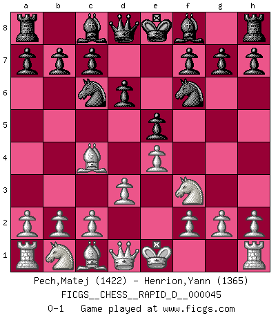 Last move : 0-1 2010 October 12 21:47:5 [Event "FICGS__CHESS__RAPID_D__000045"] [Site "FICGS"] [Date "2010.08.24"] [Round "1"] [White "Pech,Matej"] [Black "Henrion,Yann"] [Result "0-1"] [WhiteElo "1422"] [BlackElo "1365"] 1.e4 e5 2.Bc4 Nf6 3.d3 Nc6 4.Nf3 d6 0-1 This chess game has been lost on time (started : 2010.08.24 8:8:50) Bishop's Opening : Berlin defense Player Black won this chess game. Follow this game move after move (download)The passion for playing Chess is one of the most unaccountable in the world. (H.G. Wells) Dieses schreckliche Gefühl, dass ich gegen eine Maschine spielte, die niemals Fehler macht, zerschmetterte meinen Widerstand. (Mark Taimanov) No hay otro maestro que tenga una voluntad terrífica de ganar. Al tablero, el irradía peligro y aún los oponentes mas fuertes tienden a congelarse como liebres cuando olfatean a una pantera. Aún sus debilidades son peligrosas. Con las blancas, su juego de apertura es predecible - te es posible hacer planes en su contra - pero es tan fuerte que tus planes casi nunca funcionan. En el juego medio, su precisión e invención son fabulosas y en finales, tú simplemente no le puedes vencer. (Experto Alemán anónimo) Le thème de l'attaque double intervient d'une manière ou d'une autre dans l'immense majorité des combinaisons. (Youri Averbakh) A proverb is a short sentence based on long experience. (Miguel de Cervantes)