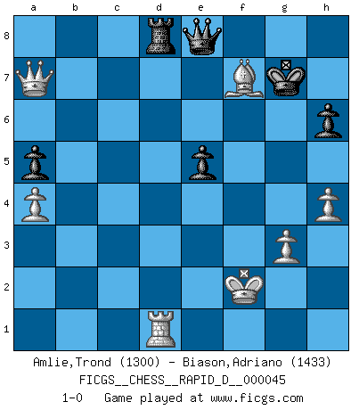 Last move : 1-0 2010 November 23 23:8:0 [Event "FICGS__CHESS__RAPID_D__000045"] [Site "FICGS"] [Date "2010.08.24"] [Round "1"] [White "Amlie,Trond"] [Black "Biason,Adriano"] [Result "1-0"] [WhiteElo "1300"] [BlackElo "1433"] 1.d4 Nf6 2.c4 e6 3.Nc3 Bb4 4.Qc2 O-O 5.a3 Bxc3+ 6.Qxc3 b6 7.Bg5 Bb7 8.e3 d6 9.Ne2 Nbd7 10.Qc2 e5 11.d5 h6 12.Bh4 c6 13.dxc6 Bxc6 14.Nc3 Qe7 15.f3 Qe6 16.e4 Rac8 17.Rd1 Rfd8 18.Qd2 Nc5 19.b4 Nb3 20.Qb2 Nd4 21.Bf2 Nh5 22.Bxd4 exd4 23.Rxd4 Qf6 24.Qd2 Nf4 25.Qe3 Ne6 26.Rd2 Rd7 27.Kf2 Re8 28.Nd5 Qd8 29.g3 Rb7 30.h4 a5 31.Nc3 Qc7 32.b5 Bd7 33.Be2 Rd8 34.Rhd1 Be8 35.f4 f6 36.e5 fxe5 37.fxe5 dxe5 38.Rxd8 Nxd8 39.Bf3 Rb8 40.Nd5 Qc5 41.Nxb6 Qc7 42.Nd5 Qxc4 43.Nf6+ Kh8 44.Nxe8 Qxb5 45.Nxg7 Kxg7 46.a4 Qe8 47.Qa7+ Nf7 48.Bd5 Rd8 49.Bxf7 1-0 Nimzo-Indian : Classical variation Kingside Castling by player Black (move 4) Player White won this chess game. Follow this game move after move (download)There are two types of sacrifices: correct ones and mine. (Mikhail Tal) Alles was am Schachbrett zählt sind gute Züge. (Robert James Fischer) Un juego de Ajedrez es un dialogo, una conversación entre un jugador y su oponente. Cada movimiento del oponente puede contener amenazas o tropiezos, pero un jugador no se puede defender de las amenazas o tomar ventaja de los tropiezos si es que no se pregunta a sí mismo: ¿Que es lo que mi oponente va a hacer después de cada movida?. (Bruce A. Moon) Vouloir jouer aux échecs contre soi-même est aussi paradoxal que vouloir marcher sur son ombre. (Stefan Zweig) Statistics can be made to prove anything - even the truth. (Author unknown)