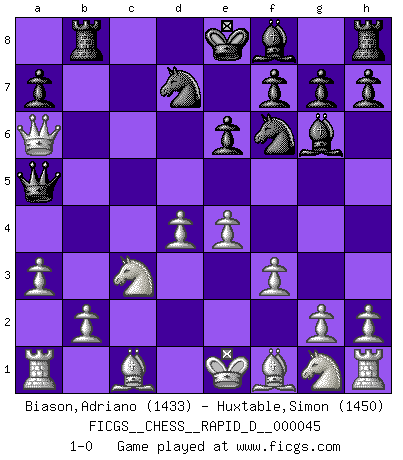 Last move : 1-0 2010 October 29 10:32:55 [Event "FICGS__CHESS__RAPID_D__000045"] [Site "FICGS"] [Date "2010.08.24"] [Round "1"] [White "Biason,Adriano"] [Black "Huxtable,Simon"] [Result "1-0"] [WhiteElo "1433"] [BlackElo "1450"] 1.d4 d5 2.c4 Nf6 3.Nc3 Bf5 4.Qb3 c6 5.Qxb7 Nbd7 6.Qxc6 Rc8 7.Qb5 Rb8 8.Qa4 dxc4 9.a3 Qc7 10.f3 e6 11.e4 Bg6 12.Qxc4 Qa5 13.Qa6 1-0 This chess game has been lost on time (started : 2010.08.24 8:8:50) QGD : Marshall defense Player White won this chess game. Follow this game move after move (download)Place the contents of the Chess box in a hat, shake them up vigorously, pour them on the board from a height of two feet, and you get the style of Steinitz. (H. E. Bird) Nicht daß Diemer aus Opportunismus Mitglied der NSDAP geworden wäre. Er war ein Fanatiker, in allem, was er tat. (Hans Ree) El Ajedrez es parte de una cultura y si una cultura esta en decadencia, entonces también el Ajedrez declinará. (Mikhail Botvinnik) Les échecs, c'est l'art d'analyser. (Mikhail Botvinnik) It is not enough to be a good player... you must also play well. (Siegbert Tarrasch)