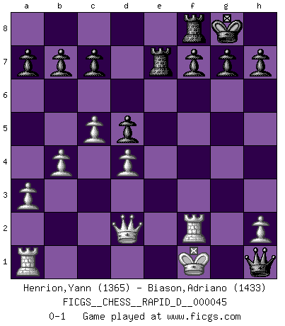Last move : 0-1 2010 October 4 23:40:47 [Event "FICGS__CHESS__RAPID_D__000045"] [Site "FICGS"] [Date "2010.08.24"] [Round "1"] [White "Henrion,Yann"] [Black "Biason,Adriano"] [Result "0-1"] [WhiteElo "1365"] [BlackElo "1433"] 1.c4 Nf6 2.Nc3 e6 3.d4 Bb4 4.Bd2 O-O 5.a3 Bxc3 6.Bxc3 Ne4 7.Qc2 Nxc3 8.Qxc3 d5 9.e3 Qd6 10.c5 Qe7 11.Nf3 Nc6 12.Bb5 Bd7 13.O-O Ne5 14.Bxd7 Nxf3+ 15.gxf3 Qxd7 16.f4 e5 17.f3 exf4 18.Rf2 fxe3 19.Qxe3 Rae8 20.Qd2 Qe6 21.Rg2 Re7 22.Kf1 Qf5 23.b4 Qxf3+ 24.Rf2 Qh1+ 0-1 English Opening Kingside Castling by player Black (move 4) Kingside Castling by player White (move 13) Player Black won this chess game. Follow this game move after move (download)All I want to do, ever, is just play Chess. (Bobby Fischer) Schach ist das Spiel, das die Verrückten gesund hält. (Albert Einstein) Las Aperturas te enseñan aperturas. ¡Los Finales te enseñan Ajedrez!. (Stephan Gerzadowicz) Les échecs sont un jeu par leur forme, un art par leur essence et une science par sa difficulté d'acquisition. Ils peuvent vous procurer autant de plaisir qu'un bon livre ou une belle musique, mais vous n'aurez une réelle joie que si vous arrivez à bien jouer. (Tigran Petrosian) The problem with manipulation is that people can turn on you. (Horatio Caine, C.S.I. Miami)