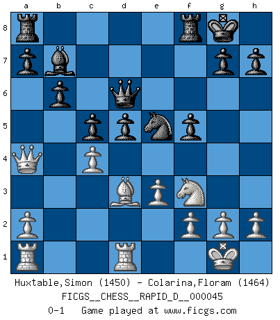 Last move : 0-1 2010 November 14 10:6:55 [Event "FICGS__CHESS__RAPID_D__000045"] [Site "FICGS"] [Date "2010.08.24"] [Round "1"] [White "Huxtable,Simon"] [Black "Colarina,Floram"] [Result "0-1"] [WhiteElo "1450"] [BlackElo "1464"] 1.d4 d5 2.c4 c6 3.Nc3 Nf6 4.Bg5 e6 5.Nf3 Be7 6.e3 O-O 7.cxd5 Nxd5 8.Bxe7 Qxe7 9.Bd3 Nd7 10.O-O Nxc3 11.bxc3 b6 12.c4 Ba6 13.Qa4 Bb7 14.Be4 Qd6 15.Rfc1 f5 16.Bd3 c5 17.d5 exd5 18.Rd1 Ne5 0-1 This chess game has been lost on time (started : 2010.08.24 8:8:50) QGD Slav defense Kingside Castling by player Black (move 6) Kingside Castling by player White (move 10) Player Black won this chess game. Follow this game move after move (download)The Pawns are the soul of the game. (Francois Andre Danican Philidor) Wenn es im Universum noch irgendwo intelligente Lebewesen gibt, dann kennen sie Go. (Emanuel Lasker) El muchacho (en ese entonces un niño de 12 años llamado Anatoly Karpov) no tiene ni idea de lo que es el Ajedrez y no hay futuro en absoluto para el en esta profesión. (Mikhail Botvinnik) Mais l'homme est une créature légère et illogique : semblable au joueur d'échecs, il n'aime que le processus du but à atteindre, non le but lui-même. (Dostoïevsky) Never was anything great achieved without danger. (Niccolo Machiavelli)