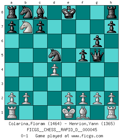 Last move : 0-1 2010 September 18 9:33:45 [Event "FICGS__CHESS__RAPID_D__000045"] [Site "FICGS"] [Date "2010.08.24"] [Round "1"] [White "Colarina,Floram"] [Black "Henrion,Yann"] [Result "0-1"] [WhiteElo "1464"] [BlackElo "1365"] 1.c4 g6 2.Nc3 Bg7 3.d4 d6 4.Nf3 e6 5.Bg5 Bf6 6.Ne4 Bxg5 7.Nfxg5 d5 8.cxd5 f5 9.Qb3 exd5 10.Nc5 Qxg5 11.Qxd5 Ne7 12.Nxb7 Nxd5 0-1 English Opening Player Black won this chess game. Follow this game move after move (download)The battle for the ultimate truth will never be won. And that's why Chess is so fascinating. (Hans Kmoch) Die starken Figuren des Gegners muss man abtauschen. (José Raúl Capablanca) No todos los artistas son jugadores de Ajedrez, pero todos los jugadores de Ajedrez son artistas. (Marcel Duchamp) Karpov est une pièce de musée. (Garry Kasparov) Convictions are more dangerous enemies of truth than lies. (Friedrich Nietzsche)