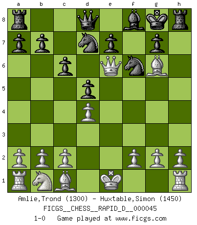 Last move : 1-0 2010 September 22 15:28:18 [Event "FICGS__CHESS__RAPID_D__000045"] [Site "FICGS"] [Date "2010.08.24"] [Round "1"] [White "Amlie,Trond"] [Black "Huxtable,Simon"] [Result "1-0"] [WhiteElo "1300"] [BlackElo "1450"] 1.e4 c6 2.d4 d5 3.e5 Bf5 4.Nf3 Nd7 5.Nh4 Bg6 6.Nxg6 hxg6 7.e6 fxe6 8.Qg4 Kf7 9.Bd3 Ngf6 10.Bxg6+ Kg8 11.Qxe6+ 1-0 Caro-Kann : Advance variation Player White won this chess game. Follow this game move after move (download)A passed Pawn increases in strength as the number of pieces on the board diminishes. (Capablanca) Obwohl ich vom Stil her kaum zu den Priestern der Schachkunst gezählt werde, halte ich Schach doch für eine Kunst. (Tigran Petrosjan) Botvinnik trataba de restarle el misterio al Ajedrez, siempre relacionandolo a situaciones de la vida ordinaria. El gustaba de llamar al Ajedrez un típico problema inexacto similar a aquellos de los cuales la gente siempre tiene que enfrentarse en la vida cotidiana. (Garry Kasparov) J'ai vu le vaincu d'Echecs jouer des années durant dans l'espoir de la fête de la victoire. Car tu es plus riche de ce qu'elle existe si même elle n'est point pour toi. Ainsi de la perle du fond des mers. (Antoine de Saint-Exupéry) Creativity is inventing, experimenting, growing, taking risks, breaking rules, making mistakes, and having fun. (Mary Lou Cook)