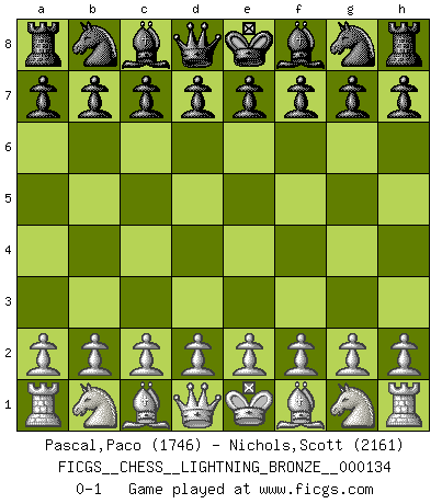 Last move : 0-1 2010 August 24 22:46:38 [Event "FICGS__CHESS__LIGHTNING_BRONZE__000134"] [Site "FICGS"] [Date "2010.08.24"] [Round "1"] [White "Pascal,Paco"] [Black "Nichols,Scott"] [Result "0-1"] [WhiteElo "1746"] [BlackElo "2161"] 0-1 This chess game has been lost on time (started : 2010.08.24 19:1:43) Player Black won this chess game. Follow this game move after move (download)I'm not afraid of Spassky. The world knows I'm the best. You don't need a match to prove it. (Bobby Fischer) Ohne Fehler kann es keine Brillanz geben. (Emanuel Lasker) Uno por uno, yo los acribillé, mi superioridad muy pronto se volvio aparente. (Jose Capablanca) Avant la finale, les dieux ont créé le milieu de partie. (Tarrasch) There will be no order, only chaos. (Sol Robeson in Pi by Darren Aronofsky)