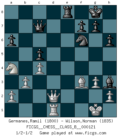 Last move : 1/2-1/2 2010 September 18 11:26:7 [Event "FICGS__CHESS__CLASS_B__000121"] [Site "FICGS"] [Date "2010.08.24"] [Round "1"] [White "Germanes,Ramil"] [Black "Wilson,Norman"] [Result "1/2-1/2"] [WhiteElo "1800"] [BlackElo "1835"] 1.e4 c5 2.Nf3 e6 3.d4 cxd4 4.Nxd4 Nc6 5.Nc3 Qc7 6.Be2 a6 7.O-O Nf6 8.Be3 Bb4 9.Na4 O-O 10.Nxc6 bxc6 11.Bb6 Qb8 12.f4 Be7 13.e5 Nd5 14.Bd4 d6 15.exd6 Bxd6 16.g3 e5 17.fxe5 Bxe5 18.Bf3 Bh3 19.Bxe5 Qxe5 20.Re1 Qf5 21.Rc1 Rac8 22.Qe2 Nf6 23.Qd3 Qb5 24.b3 Rfd8 25.Qc3 c5 26.Qe3 Qa5 27.Rcd1 h6 28.c4 Rxd1 29.Rxd1 Re8 30.Qd2 Qc7 1/2-1/2 Sicilian : Taimanov (Bastrikov) variation Kingside Castling by player White (move 7) Kingside Castling by player Black (move 9) This chess game ended in a draw. Follow this game move after move (download)During a Chess competition a Chessmaster should be a combination of a beast of prey and a monk. (Alexander Alekhine) Auf jeden Fall musst du zuerst Rechtsanwalt werden, damit du deine eigenen Interessen und die deiner Familie vertreten kannst. [Brief an seinen Sohn] (José Raúl Capablanca) El Ajedrez es imaginación. (David Bronstein) Seul un grand joueur sait à quel point il joue faiblement. (Xavier Tartacover) A belief is an idea the mind possesses, an idea that possesses the mind. (Robert Oxden Bolton)