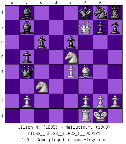 Last move : 1-0 2010 October 4 10:51:44 [Event "FICGS__CHESS__CLASS_B__000121"] [Site "FICGS"] [Date "2010.08.24"] [Round "1"] [White "Wilson,Norman"] [Black "Nellutla,Manobhiram"] [Result "1-0"] [WhiteElo "1835"] [BlackElo "1800"] 1.d4 d5 2.c4 dxc4 3.e4 b5 4.a4 Qd7 5.axb5 Qxb5 6.Nc3 Qc6 7.Nf3 e6 8.Ne5 Qd6 9.Bxc4 a6 10.Bf4 Qb4 11.O-O Bd6 12.Bb5+ axb5 13.Rxa8 c6 14.d5 Bb7 15.dxe6 fxe6 16.Rxb8+ Bxb8 17.Qd7+ Kf8 18.Qf7+ 1-0 QGA : 3.e4 Kingside Castling by player White (move 11) Player White won this chess game. Follow this game move after move (download)On the chessboard, lies and hypocrisy do not survive long. (Emanuel Lasker) Ich verstehe Aljechins Kombinationen ganz gut; aber woher er diese Angriffschancen bekommt und wie er die Eröffnung behandelt das ist für mich ein Buch mit sieben Siegeln. (Rudolf Spielmann) Yo considero que Fischer es uno de los expertos mas grandes de aperturas de siempre. (Keith Hayward) À la honte des hommes, on sait que les lois du jeu sont les seules qui soient partout justes, claires, inviolables et exécutées. Pourquoi l'Indien qui a donné les règles du jeu d'échecs est-il obéi de bon gré dans toute la terre, et que les décrétales des papes, par exemple, sont aujourd'hui un objet d'horreur et de mépris ? C'est que l'inventeur des échecs combina tout avec justesse pour la satisfaction des joueurs, et que les papes, dans leurs décrétales, n'eurent en vue que leur seul avantage. L'Indien voulut exercer également l'esprit des hommes et leur donner du plaisir; les papes ont voulu abrutir l'esprit des hommes. Voltaire (Dictionnaire philosophique / Garnier 1967) If we don't succeed, we run the risk of failure. (George W. Bush)