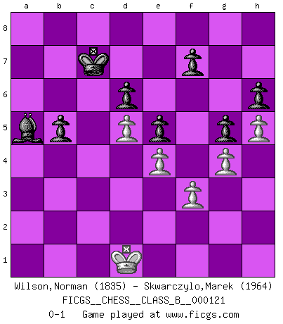 Last move : 0-1 2010 November 4 8:47:33 [Event "FICGS__CHESS__CLASS_B__000121"] [Site "FICGS"] [Date "2010.08.24"] [Round "1"] [White "Wilson,Norman"] [Black "Skwarczylo,Marek"] [Result "0-1"] [WhiteElo "1835"] [BlackElo "1964"] 1.d4 Nf6 2.c4 g6 3.Nc3 Bg7 4.e4 O-O 5.Be2 d6 6.Bg5 h6 7.Be3 e5 8.d5 a5 9.Qd2 Kh7 10.h4 Na6 11.h5 g5 12.f3 Nd7 13.Nh3 Ndc5 14.g4 Bf6 15.O-O-O Bd7 16.Nb5 a4 17.Kb1 Be7 18.Nf2 Qb8 19.Bf1 c6 20.Nc3 Qc7 21.Ne2 cxd5 22.cxd5 Rfc8 23.Rc1 Qb6 24.Nd3 Bd8 25.Qd1 Qa7 26.Nxc5 Nxc5 27.Nc3 Qa5 28.Bd2 Qb6 29.Bc4 Kg7 30.Qe2 Nb3 31.Bxb3 axb3 32.a3 Qc5 33.Rhe1 Ba5 34.Nd1 Qc2+ 35.Rxc2 bxc2+ 36.Ka2 Bxd2 37.Nc3 c1Q 38.Rxc1 Bxc1 39.Kb1 Rxc3 40.bxc3 Bxa3 41.Qc4 Bc5 42.Qe2 Ra3 43.Qb2 Ba4 44.Qd2 Rb3+ 45.Ka2 Ba3 46.Qe1 Bb2 47.Qf1 Bxc3 48.Qc4 b5 49.Qxb3 Bxb3+ 50.Kxb3 Ba5 51.Kc2 Kf8 52.Kb3 Ke7 53.Kc2 Kd7 54.Kd1 Kc7 0-1 King's Indian : 4.e4 Kingside Castling by player Black (move 4) Queenside Castling by player White (move 15) Promotion Queen by player Black (move 37) Player Black won this chess game. Follow this game move after move (download)Your body has to be in top condition. Your Chess deteriorates as your body does. You can't separate body from mind. (Bobby Fischer) Mit Schach schule ich mein Gefühl für Geometrie, was für Tennis und Schach gleichermaßen wichtig ist. (Boris Becker) Existen dos clases de sacrificios: los correctos y los míos. (Mikhail Tal) Vous savez, camarade Pachman, je n'éprouve pas de plaisir à être ministre, je jouerais plutôt aux échecs comme vous, ou alors ferais une révolution au Venezuela. (Che Guevara à Ludek Pachman, 'Checkmate in Prague', 1975) That's absurd. I love it. (Gregory House, House M.D.)