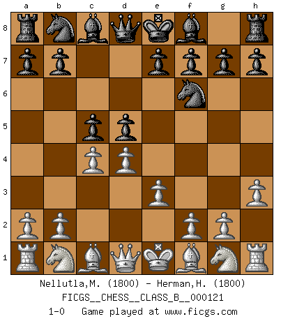 Last move : 1-0 2010 October 11 21:43:10 [Event "FICGS__CHESS__CLASS_B__000121"] [Site "FICGS"] [Date "2010.08.24"] [Round "1"] [White "Nellutla,Manobhiram"] [Black "Herman,Herdiansyah"] [Result "1-0"] [WhiteElo "1800"] [BlackElo "1800"] 1.d4 d5 2.e3 Nf6 3.h3 c5 4.c4 1-0 This chess game has been lost on time (started : 2010.08.24 20:8:48) Queen's pawn game Player White won this chess game. Follow this game move after move (download)In life, as in Chess, one's own Pawns block one's way. A man's very wealth, ease, leisure, children, books, which should help him to win, more often checkmate him. (Charles Buxton) Im Internet Chess Club betrug mein Rating vorübergehend 3350 ELO-Punkte. (Sergej Karjakin) Los finales de Peón son del Ajedrez lo que el cesped es del Golf. (Cecil Purdy) Le jeu d'échecs fait naître et fortifie en nous plusieurs qualités précieuses dans le cours de l'existence, telles que la prévoyance, la circonspection, la prudence, et la persévérance. (Benjamin Franklin - 1783, la morale des échecs) The best weapon against an enemy is another enemy. (Friedrich Nietzsche)