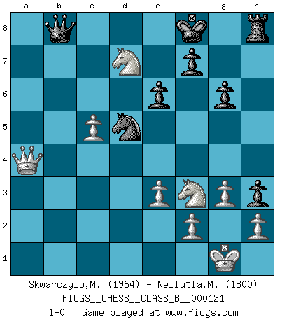 Last move : 1-0 2010 August 27 22:14:15 [Event "FICGS__CHESS__CLASS_B__000121"] [Site "FICGS"] [Date "2010.08.24"] [Round "1"] [White "Skwarczylo,Marek"] [Black "Nellutla,Manobhiram"] [Result "1-0"] [WhiteElo "1964"] [BlackElo "1800"] 1.d4 d5 2.Nf3 a6 3.c4 dxc4 4.e3 b5 5.a4 Bb7 6.axb5 axb5 7.Rxa8 Bxa8 8.b3 Bd5 9.bxc4 Bxc4 10.Bxc4 bxc4 11.Qa4+ c6 12.O-O Nf6 13.Ba3 e6 14.Bxf8 Kxf8 15.Na3 h5 16.Nxc4 h4 17.Nce5 c5 18.dxc5 h3 19.g3 Nd5 20.Rb1 g6 21.Rxb8 Qxb8 22.Nd7+ 1-0 Queen's pawn game Kingside Castling by player White (move 12) Player White won this chess game. Follow this game move after move (download)All I want to do, ever, is just play Chess. (Bobby Fischer) Um sich vor der Gefahr einer Erkältung zu schützen, sorge der wanderlustige König beizeiten für ein brauchbares Versteck. (Aaron Nimzowitsch) Del Ajedrez se ha dicho que la vida no es lo suficientemente larga para él, pero eso es culpa de la vida, no del Ajedrez. (William Ewart Napier) La menace est plus forte que l'exécution. (Aaron Nimzovitch) When it is a question of money, everybody is of the same religion. (Voltaire)