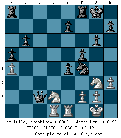 Last move : 0-1 2010 September 3 21:56:20 [Event "FICGS__CHESS__CLASS_B__000121"] [Site "FICGS"] [Date "2010.08.24"] [Round "1"] [White "Nellutla,Manobhiram"] [Black "Josse,Mark"] [Result "0-1"] [WhiteElo "1800"] [BlackElo "1849"] 1.d4 Nf6 2.a3 g6 3.Bd2 Bg7 4.Bc3 d5 5.h3 O-O 6.e3 Ne4 7.Bd3 Nd7 8.Bxe4 dxe4 9.Ne2 Nf6 10.O-O b6 11.Bb4 a5 12.Bc3 Qd7 13.a4 Nd5 14.Ng3 f5 15.Nd2 Ba6 16.Re1 c5 17.Qe2 Bxe2 18.Rxe2 cxd4 19.Bxd4 Bxd4 20.exd4 Nf4 21.Re3 Qxd4 22.Rd1 Qxb2 23.R3e1 Qxc2 0-1 Queen's pawn game Kingside Castling by player Black (move 5) Kingside Castling by player White (move 10) Player Black won this chess game. Follow this game move after move (download)Chess holds its master in its own bonds, shackling the mind and brain so that the inner freedom of the very strongest must suffer. (Albert Einstein) Rubinstein ist ein Turmendspiel, welches die Götter vor tausenden von Jahren begannen. (Savielly Grigorievitsch Tartakower) No soy una persona materialista y por eso, no resiento la falta o pérdida del dinero. La ausencia de cosas mundanas carece de importancia. Ya que el Ajedrez es una forma en la que puedo ser tan materialista como yo desee sin tener la necesidad de vender mi alma. (Jamie Walter Adams) Le jeu d'échecs est comme rejeté hors du temps. (Antoine de Saint-Exupéry) Dave, my mind is going. I can feel it. (HAL 9000 in 2001, a space odyssey)