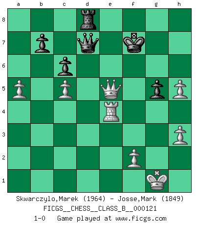 Last move : 1-0 2010 October 24 22:49:6 [Event "FICGS__CHESS__CLASS_B__000121"] [Site "FICGS"] [Date "2010.08.24"] [Round "1"] [White "Skwarczylo,Marek"] [Black "Josse,Mark"] [Result "1-0"] [WhiteElo "1964"] [BlackElo "1849"] 1.d4 Nf6 2.Nf3 d5 3.c4 c6 4.e3 Bg4 5.h3 Bxf3 6.Qxf3 e6 7.Nc3 Nbd7 8.Bd3 Bd6 9.O-O O-O 10.b3 Qe7 11.Bb2 Rfe8 12.Rac1 e5 13.Bb1 exd4 14.exd4 dxc4 15.bxc4 Bc7 16.Na4 Ne4 17.Rce1 Ndf6 18.Ba3 Qe6 19.Qd3 Qd7 20.Nc5 Nxc5 21.Bxc5 Bb6 22.Bxb6 axb6 23.Rxe8+ Rxe8 24.Rd1 g6 25.Qb3 Nh5 26.Qxb6 Nf4 27.Qb4 Ne2+ 28.Kh1 Nxd4 29.c5 Rd8 30.Bc2 Kg7 31.Bb3 f5 32.Bc4 Qc7 33.Bf1 Qd7 34.a4 Kf6 35.Bc4 g5 36.a5 Qe7 37.Re1 Qc7 38.Qc3 Kg6 39.g4 f4 40.Re4 Qd7 41.Qe1 Kf6 42.Kg2 h5 43.gxh5 f3+ 44.Kh2 Qc7+ 45.Kg1 Ne2+ 46.Bxe2 fxe2 47.Qxe2 Qd7 48.Qb2+ Kf7 49.Qe5 1-0 Queen's pawn game Kingside Castling by player White (move 9) Kingside Castling by player Black (move 9) Player White won this chess game. Follow this game move after move (download)A bad day of Chess is better than any good day at work. (Anonymous) Jeder Fehler erscheint unglaublich dumm, wenn andre ihn begehen. (Georg Christoph Lichtenberg) Los errores estan ahí, esperando a que se cometan. (Savielly Tartakower) La guerre est enfant de la passion, la passion est enfant du narcissisme et le narcissisme est l'enfant. (...) Une autre partie ? (Thibault de Vassal) Once you start thinking you have nothing left to learn, you have everything to learn. (Steve Badget)