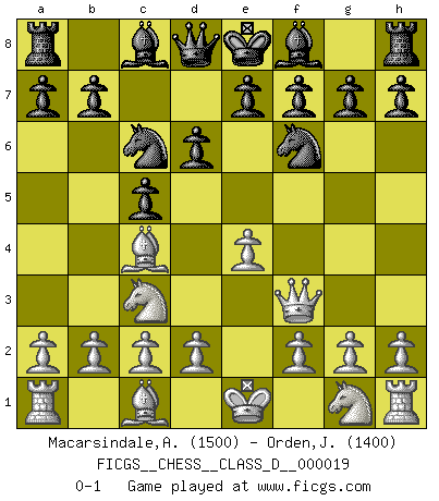 Last move : 0-1 2007 January 19 12:45:41 [Event "FICGS__CHESS__CLASS_D__000019"] [Site "FICGS"] [Date "2006.11.18"] [Round "1"] [White "Macarsindale,Arthur Alfred"] [Black "Orden,Jorge"] [Result "0-1"] [WhiteElo "1500"] [BlackElo "1400"] 1.e4 c5 2.Bc4 d6 3.Qf3 Nf6 4.Nc3 Nc6 0-1 Sicilian defense Player Black won this chess game. Follow this game move after move (download)A chess genius has died; a loss for humanity. (Viktor Kortchnoi, about Bobby Fischer's death) Ich war zu klein für die Schach-Schülermannschaft! (Woody Allen) Yo creo que el Ajedrez posee una magia que es también una ayuda en la edad avanzada. Una rodilla reumática es olvidada durante una partida de Ajedrez y otros eventos pueden parecer algo sin importancia comparada a una catástrofe en el tablero de Ajedrez. (Vlastimil Hort) Les échecs sont utiles à l'exercice de la faculté de penser et à celle de l'imagination. Car nous devons posséder une méthode élaborée pour atteindre des buts partout où nous devons conduire notre raison. (Leibnitz) There is a very easy way to return from a casino with a small fortune : go there with a large one. (Jack Yelton)