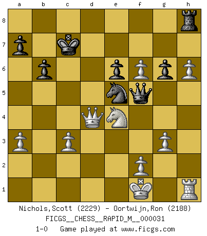 Last move : 1-0 2010 September 8 10:10:51 [Event "FICGS__CHESS__RAPID_M__000031"] [Site "FICGS"] [Date "2010.08.26"] [Round "1"] [White "Nichols,Scott"] [Black "Oortwijn,Ron"] [Result "1-0"] [WhiteElo "2229"] [BlackElo "2188"] 1.d4 e6 2.e4 d5 3.Nc3 Bb4 4.e5 c5 5.a3 Bxc3+ 6.bxc3 Qa5 7.Bd2 Qa4 8.Qg4 Kf8 9.Qd1 b6 10.c4 Ne7 11.Nf3 Ba6 12.cxd5 Bxf1 13.Kxf1 Nxd5 14.h4 Qc4+ 15.Kg1 cxd4 16.h5 Nc6 17.h6 g6 18.Bg5 Nc3 19.Qd2 Ne4 20.Qf4 Nc3 21.Qh4 Nd5 22.Bf6 Qc3 23.Rd1 Rg8 24.Bg7+ Ke8 25.Qe4 Kd7 26.Ng5 Qc5 27.Nxh7 Rh8 28.Ng5 Nc3 29.Qf3 Nxd1 30.Qxd1 f6 31.Ne4 Qa5 32.Bxh8 Rxh8 33.exf6 Qf5 34.Qd3 Qf4 35.g3 Qf5 36.c3 Ne5 37.Qxd4+ Kc7 38.Kf1 1-0 Queen's pawn Player White won this chess game. Follow this game move after move (download)If you aren't afraid of Spassky, then I have removed the element of money. (Jim Slater) Schach ist Leben. (Robert James Fischer) Bobby solo arroja las piezas y solas caen en las casillas correctas. (Miguel Najdorf ) Vouloir jouer aux échecs contre soi-même est aussi paradoxal que vouloir marcher sur son ombre. (Stefan Zweig) Just because you do not take an interest in politics doesn't mean politics won't take an interest in you. (Pericles 430 B.C.)