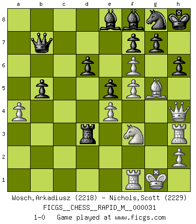 Last move : 1-0 2010 November 3 15:10:0 [Event "FICGS__CHESS__RAPID_M__000031"] [Site "FICGS"] [Date "2010.08.26"] [Round "1"] [White "Wosch,Arkadiusz"] [Black "Nichols,Scott"] [Result "1-0"] [WhiteElo "2218"] [BlackElo "2229"] 1.e4 c5 2.Nf3 e6 3.d4 cxd4 4.Nxd4 a6 5.Bd3 Bc5 6.Nb3 Be7 7.O-O d6 8.c4 Nf6 9.Nc3 b6 10.f4 Nc6 11.Qf3 Bb7 12.Be3 O-O 13.Rad1 Qc7 14.a3 Rfe8 15.Qh3 Rad8 16.Rc1 Rc8 17.Nd2 h6 18.Rf3 Bf8 19.Rg3 Kh8 20.Rf1 Ne7 21.f5 e5 22.Nf3 Bc6 23.Ng5 Neg8 24.Qh4 Re7 25.a4 Qb7 26.Rh3 Rec7 27.g4 Be8 28.Nf3 b5 29.cxb5 Rxc3 30.bxc3 axb5 31.g5 Rxc3 32.gxf6 Rxd3 33.Bg5 1-0 Sicilian : Kan, Polugaievsky variation Kingside Castling by player White (move 7) Kingside Castling by player Black (move 12) Player White won this chess game. Follow this game move after move (download)First-class players lose to second-class players because second-class players sometimes play a first-class game. (Siegbert Tarrasch) Taktik ist was man tun muß, wenn etwas zu tun ist. Strategie ist was man tun muß, wenn nichts zu tun ist. (Savielly Grigorievitsch Tartakower) El Ajedrez es sobre todo, ¡una pelea!. (Emanuel Lasker) Les Echecs ne sont pas pour les âmes timides. Ils requièrent un homme entier, qui ne s'arrête pas aveuglément à ce qui a été déjà établi, mais qui tente individuellement de sonder les profondeurs du jeu. (W. Steinitz) The Movers & Shakers of this world are those who play chess in the mornings and go to the disco in the evenings. (Dinesh De Silva)