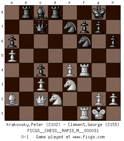Last move : 0-1 2010 October 14 12:33:18 [Event "FICGS__CHESS__RAPID_M__000031"] [Site "FICGS"] [Date "2010.08.26"] [Round "1"] [White "Krakovsky,Peter"] [Black "Clement,George"] [Result "0-1"] [WhiteElo "2102"] [BlackElo "2155"] 1.e4 e5 2.Nf3 Nc6 3.Bb5 a6 4.Ba4 Nf6 5.O-O b5 6.Bb3 Bb7 7.d3 Bc5 8.a4 b4 9.Nbd2 d6 10.Nc4 Rb8 11.Be3 Bxe3 12.Nxe3 O-O 13.Qd2 Na5 14.Ba2 c5 15.Qe2 Bc8 16.Nd2 Nc6 17.c3 h6 18.Qd1 Ne7 19.Qc2 Qc7 20.a5 Rd8 21.f4 exf4 22.Rxf4 d5 23.Raf1 c4 24.dxc4 bxc3 25.bxc3 dxc4 0-1 Ruy Lopez : Archangelsk (counterthrust) variation Kingside Castling by player White (move 5) Kingside Castling by player Black (move 12) Player Black won this chess game. Follow this game move after move (download)In Chess, as it is played by masters, chance is practically eliminated. (Emanuel Lasker) Ich war zu klein für die Schach-Schülermannschaft! (Woody Allen) Sin errores no puede haber brillantez. (Emanuel Lasker) Votre prénom est 'Tactique', votre deuxième prénom est 'Tactique' et votre nom est 'Tactique'. (Ken Smith) Everybody lies. (Gregory House, House M.D.)