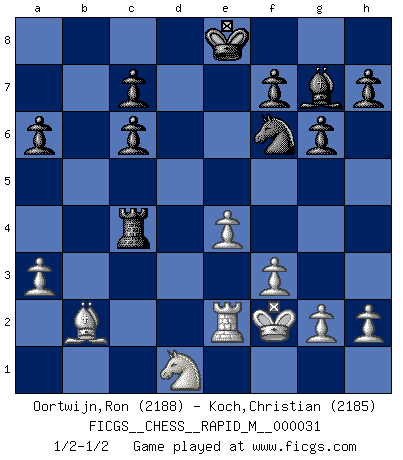 Last move : 1/2-1/2 2010 September 18 7:53:49 [Event "FICGS__CHESS__RAPID_M__000031"] [Site "FICGS"] [Date "2010.08.26"] [Round "1"] [White "Oortwijn,Ron"] [Black "Koch,Christian"] [Result "1/2-1/2"] [WhiteElo "2188"] [BlackElo "2185"] 1.c4 e5 2.Nc3 Nc6 3.e3 Nf6 4.b3 g6 5.Nf3 Bg7 6.d4 exd4 7.Nxd4 O-O 8.Bb2 Re8 9.Nxc6 dxc6 10.Qxd8 Rxd8 11.f3 a6 12.Na4 Re8 13.Kf2 b5 14.Nc3 Rd8 15.Rd1 Rxd1 16.Nxd1 Be6 17.Be2 bxc4 18.Bxc4 Bxc4 19.bxc4 Rb8 20.Re1 Rb4 21.Re2 Rxc4 22.e4 Kf8 23.Ba3+ Ke8 24.Bb2 Ra4 25.a3 Rc4 1/2-1/2 English : Sicilian Reversed Kingside Castling by player Black (move 7) This chess game ended in a draw. Follow this game move after move (download)An attack on the wing should be met by play in the center. (Nimzovitch) Garry Kasparov war erst in der Großmeister-Organisation GMA, dann in der Profischach-Vereinigung PCA, zum Schluss kehrte er wieder in den Schoß der FIDE zurück. Aber gut, manche Leute sind flexibel (Viswanathan Anand) El Ajedrez es un terrible juego. Si no controlas el centro, tu oponente tiene una posición mas holgada. Si tienes control del centro, ¡entonces realmente tu tienes algo de que preocuparte!. (Siegbert Tarrasch) RxDa4 pat (...) Wisdom doesn't necessarily come with age. Sometimes age just shows up all by itself. (Tom Wilson)