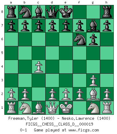 Last move : 0-1 2006 December 29 8:48:52 [Event "FICGS__CHESS__CLASS_D__000019"] [Site "FICGS"] [Date "2006.11.18"] [Round "1"] [White "Freeman,Tyler"] [Black "Nesko,Lawrence"] [Result "0-1"] [WhiteElo "1400"] [BlackElo "1400"] 1.g3 Nf6 2.Bg2 g6 3.c4 Bg7 0-1 This chess game has been lost on time (started : 2006.11.18 14:12:55) Benko's Opening Player Black won this chess game. Follow this game move after move (download)Everything is in a state of flux, and this includes the world of Chess. (Mikhail Botvinnik) Die starken Figuren des Gegners muss man abtauschen. (José Raúl Capablanca) La última cosa en que Fischer estaba interesado era en tonterías, siempre y cuando el Ajedrez estuviera involucrado. (Elie Agur) La tactique est l'élément le plus important du milieu de jeu. (Siegbert Tarrasch) Ah, beer! The cause of, and the solution to, all of life's problems. (Homer Simpson)