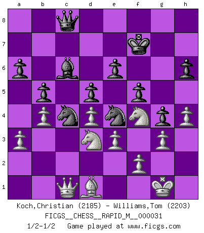 Last move : 1/2-1/2 2010 October 11 19:54:22 [Event "FICGS__CHESS__RAPID_M__000031"] [Site "FICGS"] [Date "2010.08.26"] [Round "1"] [White "Koch,Christian"] [Black "Williams,Tom"] [Result "1/2-1/2"] [WhiteElo "2185"] [BlackElo "2203"] 1.d4 d5 2.c4 e6 3.Nf3 c6 4.e3 Nf6 5.b3 Ne4 6.Bd3 Bd6 7.O-O O-O 8.Qc2 f5 9.Ba3 Bxa3 10.Nxa3 Qe7 11.Nb1 Nd7 12.Nc3 b6 13.cxd5 cxd5 14.Ne2 Bb7 15.Rac1 Rac8 16.Qb2 g5 17.h3 a6 18.Rxc8 Rxc8 19.Rc1 Rxc1+ 20.Qxc1 Qd6 21.b4 b5 22.a3 h6 23.h4 g4 24.Ne1 Nb6 25.Bc2 Qd8 26.g3 Nc4 27.Nd3 Kf7 28.Nef4 Qc8 29.Bd1 Bc6 1/2-1/2 Queen's gambit declined Kingside Castling by player White (move 7) Kingside Castling by player Black (move 7) This chess game ended in a draw. Follow this game move after move (download)Pawns: they are the soul of this game, they alone form the attack and defense. (Philidor) Es liegt in der Natur, vernüftig zu denken und unlogisch zu handeln. (Anatole France) Si yo gano un torneo, yo lo gano por mí mismo. Yo hago las jugadas. Nadie me ayuda. (Bobby Fischer) Les Echecs représentent une sphère d'idées créatrices basée sur la volonté des deux protagonistes. (Smyslov) Fortune favours the audacious. (Desiderius Erasmus)