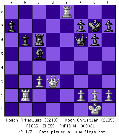 Last move : 1/2-1/2 2010 November 11 7:8:0 [Event "FICGS__CHESS__RAPID_M__000031"] [Site "FICGS"] [Date "2010.08.26"] [Round "1"] [White "Wosch,Arkadiusz"] [Black "Koch,Christian"] [Result "1/2-1/2"] [WhiteElo "2218"] [BlackElo "2185"] 1.e4 e5 2.Nf3 Nf6 3.Nxe5 d6 4.Nf3 Nxe4 5.d4 d5 6.Bd3 Be7 7.O-O Nc6 8.c4 Nb4 9.Be2 O-O 10.Nc3 Bf5 11.a3 Nxc3 12.bxc3 Nc6 13.Re1 Re8 14.cxd5 Qxd5 15.Bf4 Rac8 16.Bd3 Qd7 17.Rb1 b6 18.d5 Bxd3 19.Qxd3 Bxa3 20.Ng5 g6 21.Ne4 Qf5 22.Bxc7 Rxc7 23.Nf6+ Qxf6 24.Rxe8+ Kg7 25.dxc6 Bc5 26.Rb2 Rxc6 1/2-1/2 Petrov : Classical attack Kingside Castling by player White (move 7) Kingside Castling by player Black (move 9) This chess game ended in a draw. Follow this game move after move (download)Up to this point White has been following well-known analysis. But now he makes a fatal error: he begins to use his own head. (Siegbert Tarrasch) Im Internet Chess Club betrug mein Rating vorübergehend 3350 ELO-Punkte. (Sergej Karjakin) El Peón aislado arroja penumbra sobre todo el tablero. (Aaron Nimzovich) Les Cavaliers se révèlent fort utiles dans les positions fermées. D'habitude, les Fous sont un peu plus forts que les Cavaliers dans les positions ouvertes. Qu'on le veuille ou non, il restera toujours des exceptions ! Is not life a hundred times too short to bore ourselves ? (Friedrich Nietzsche)