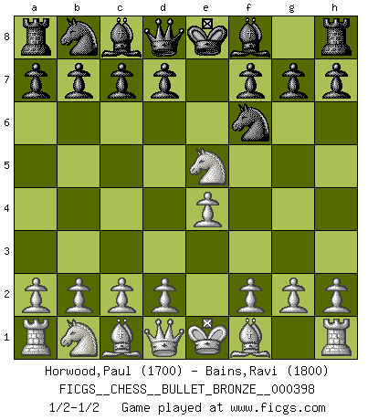 Last move : 1/2-1/2 2010 August 26 7:5:27 [Event "FICGS__CHESS__BULLET_BRONZE__000398"] [Site "FICGS"] [Date "2010.08.26"] [Round "1"] [White "Horwood,Paul"] [Black "Bains,Ravi"] [Result "1/2-1/2"] [WhiteElo "1700"] [BlackElo "1800"] 1.e4 e5 2.Nf3 Nf6 3.Nxe5 1/2-1/2 Petrov's defense This chess game ended in a draw. Follow this game move after move (download)The most important feature of the Chess position is the activity of the pieces. This is absolutely fundamental in all phases of the game: Opening, Middlegame and especially Endgame. The primary constraint on a piece's activity is the Pawn structure. (Michael Stean) Ein Isolani verdüstert die Stimmung auf dem ganzen Schachbrett. (Savielly Grigorievitsch Tartakower) Nada excita más a Grandes Maestros aburridos que una novedad teórica. (Dominic Lawson) Il vaut toujours mieux jouer un plan faux de façon logique que de n'avoir pas de plan du tout. (Victor Kortchnoï) There is a computer disease that anybody who works with computers knows about. It's a very serious disease and it interferes completely with the work. The trouble with computers is that you 'play' with them ! (Richard P. Feynman)