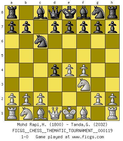 Last move : 1-0 2010 October 6 20:50:2 [Event "FICGS__CHESS__THEMATIC_TOURNAMENT__000119"] [Site "FICGS"] [Date "2010.08.27"] [Round "1"] [White "Mohd Rapi,Herwansha"] [Black "Tanda,Giovanni"] [Result "1-0"] [WhiteElo "1800"] [BlackElo "2032"] 1.e4 c5 2.d4 cxd4 3.f4 Nc6 4.Nf3 1-0 Sicilian : Smith-Morra gambit Player White won this chess game. Follow this game move after move (download)No other master has such a terrific will to win. At the board he radiates danger, and even the strongest opponents tend to freeze, like rabbits when they smell a panther. Even his weaknesses are dangerous. As white, his opening game is predictable - you can make plans against it - but so strong that your plans almost never work. In the middle game his precision and invention are fabulous, and in the end game you simply cannot beat him. (Anonymous German Expert) Wir irren allesamt, nur jeder irrt anders. (Georg Christoph Lichtenberg) Después de la respuesta de las negras a 1.e4 con 1..e5, se quedan siempre tratando de entrar dentro del juego. (Howard Staunton) Comme les marins qui ont mille raisons différentes d'aller en mer, les joueurs d'échecs en ont tout autant avant de s'installer devant une table et jouer... (Vincent Bertignac, philosophe) He is a liar. I just don't know what the lie is yet. (Horatio Caine, C.S.I. Miami)